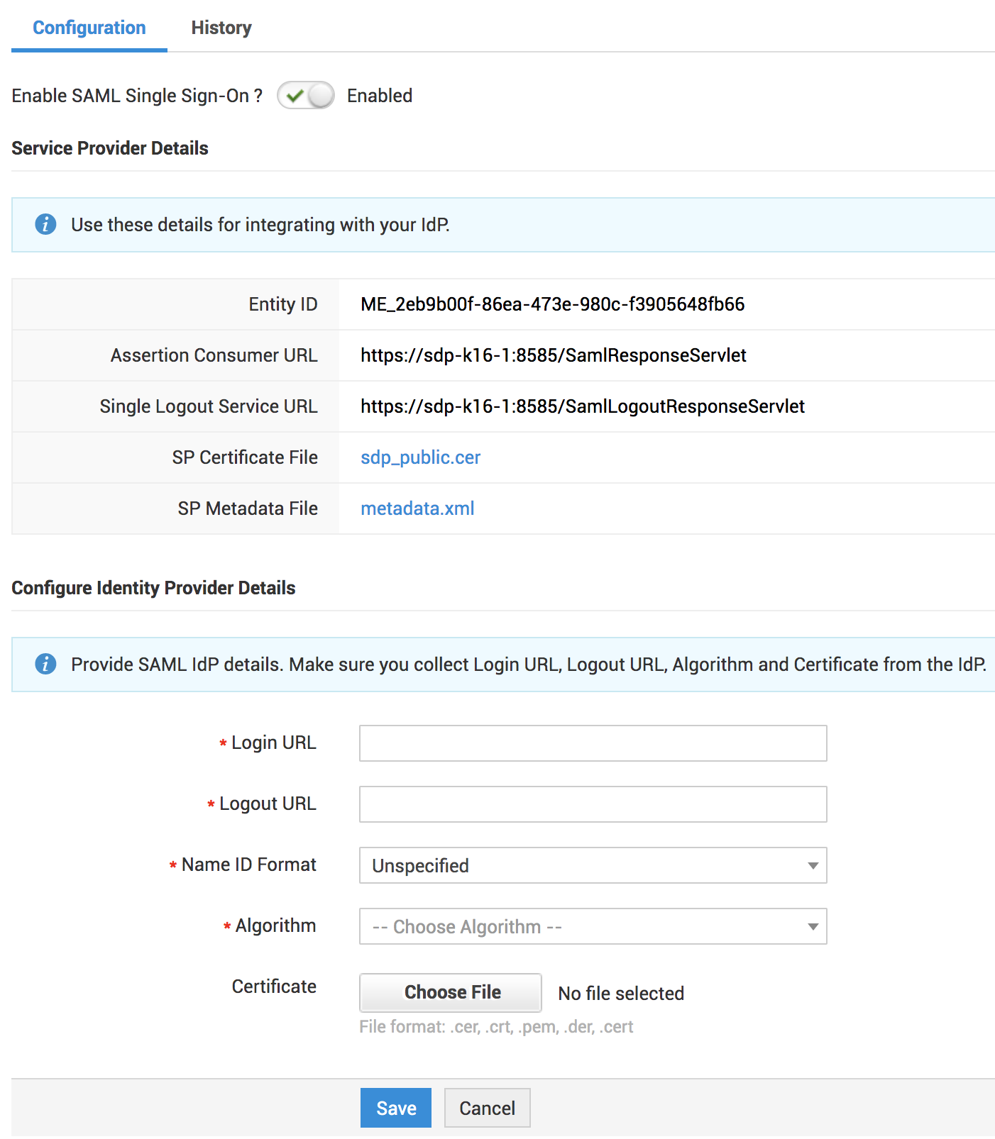 您可以使用服务提供商详细信息,将 ServiceDesk Plus 配置为与您的 IdP 配合使用的 SP。