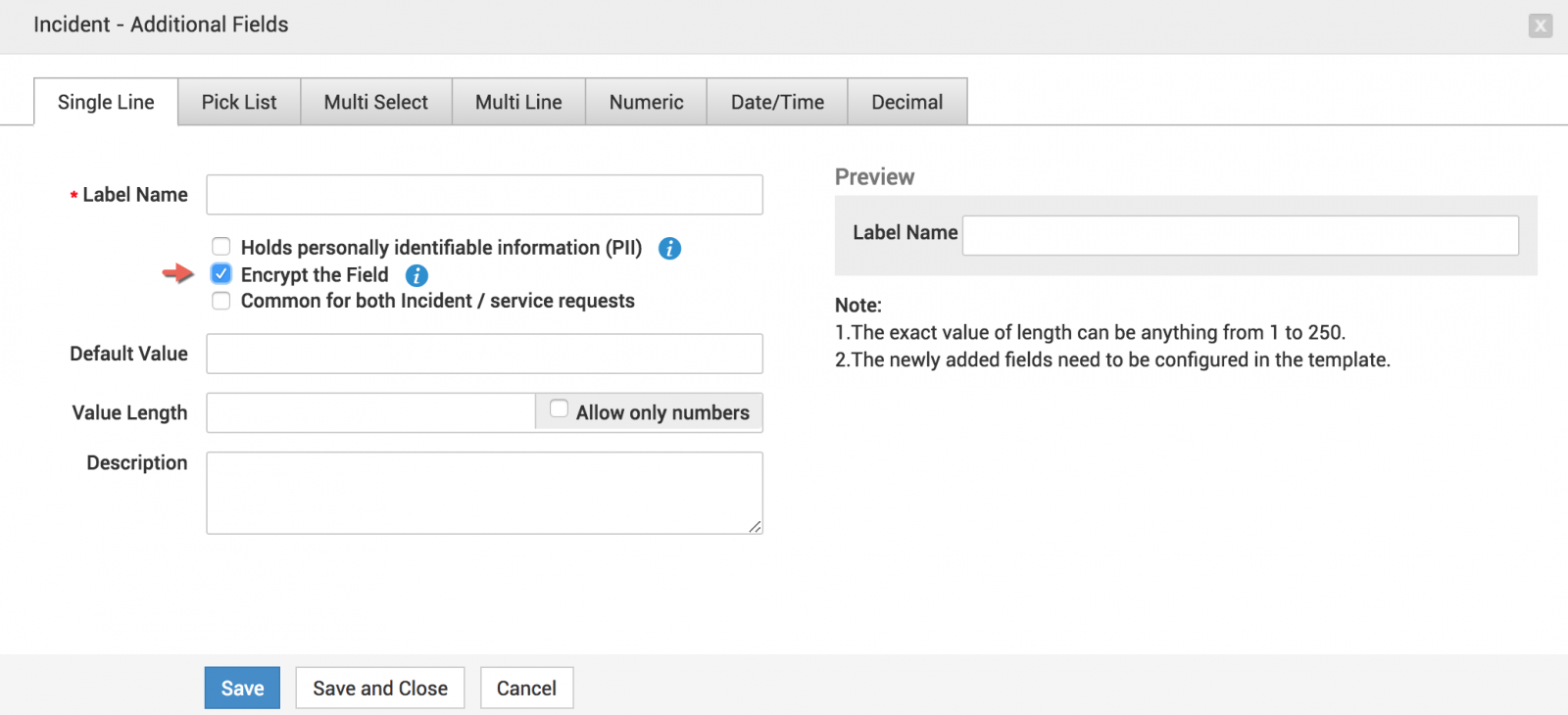 注意:加密选项仅在添加附加字段时可用。编辑附加字段时无法进行加密。另外,字段一旦被标记为加密,就无法取消该标记。