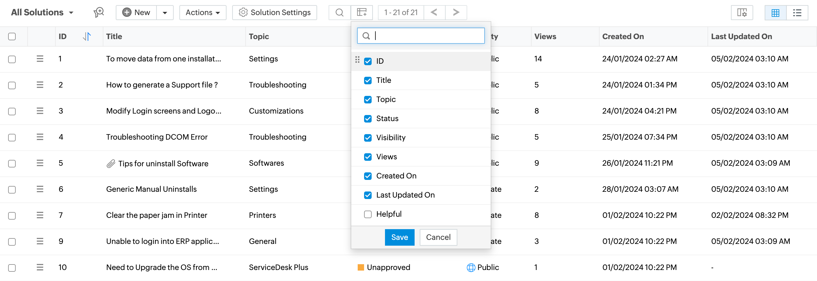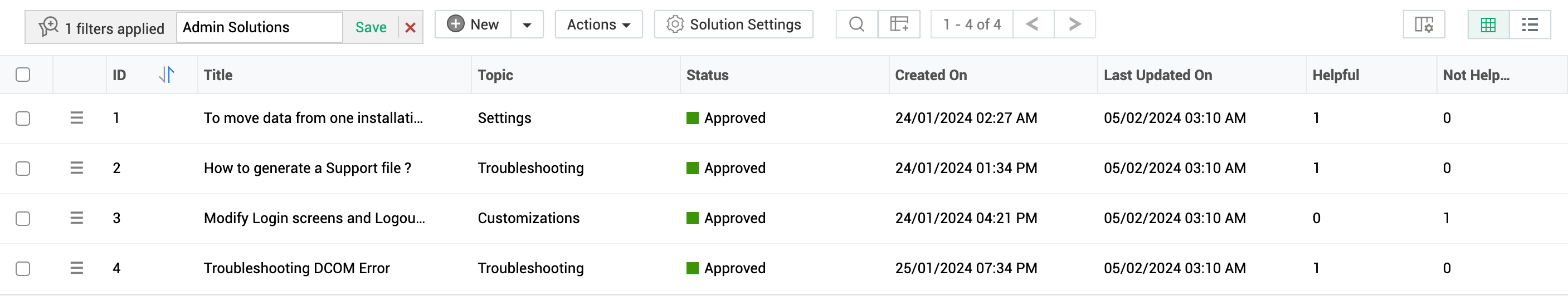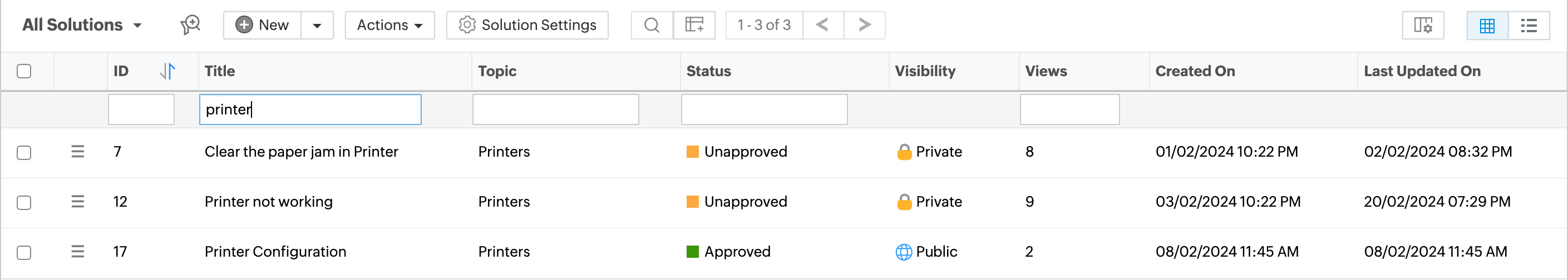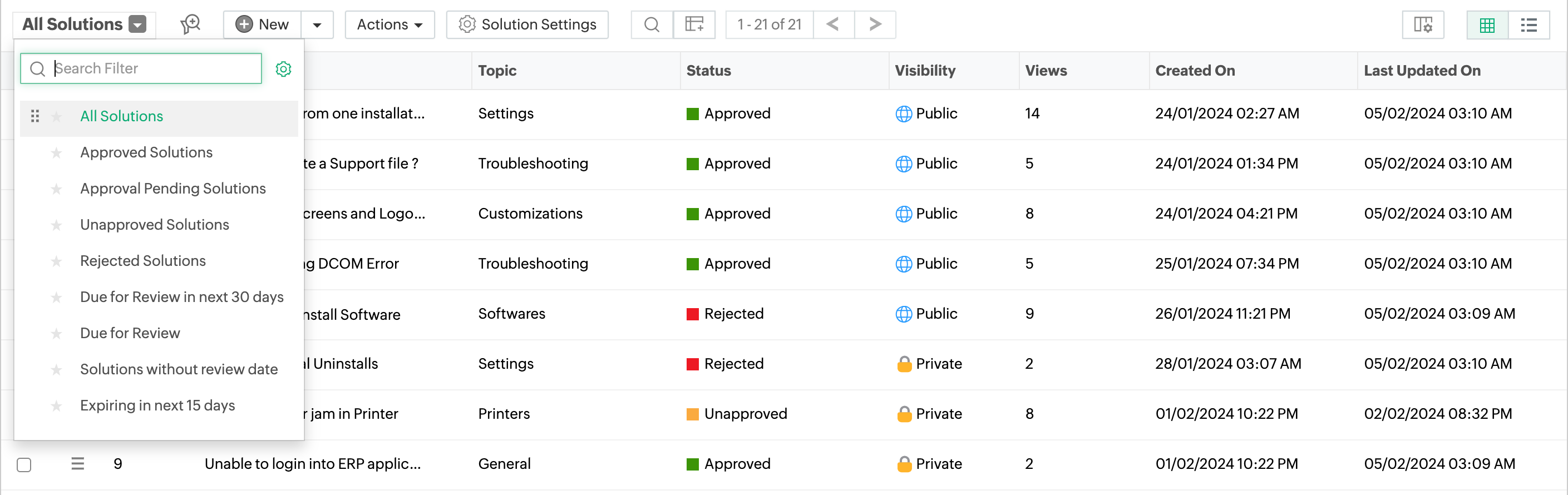 使用筛选器下拉菜单创建您自己的自定义页面,根据特定条件显示解决方案。这有助于您按照优先级和需求对解决方案进行排序和查看。