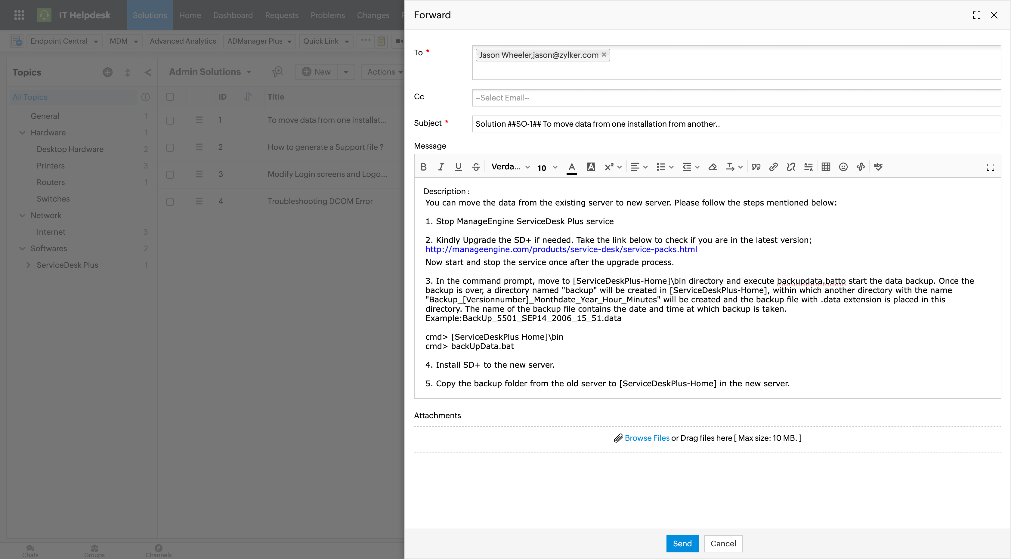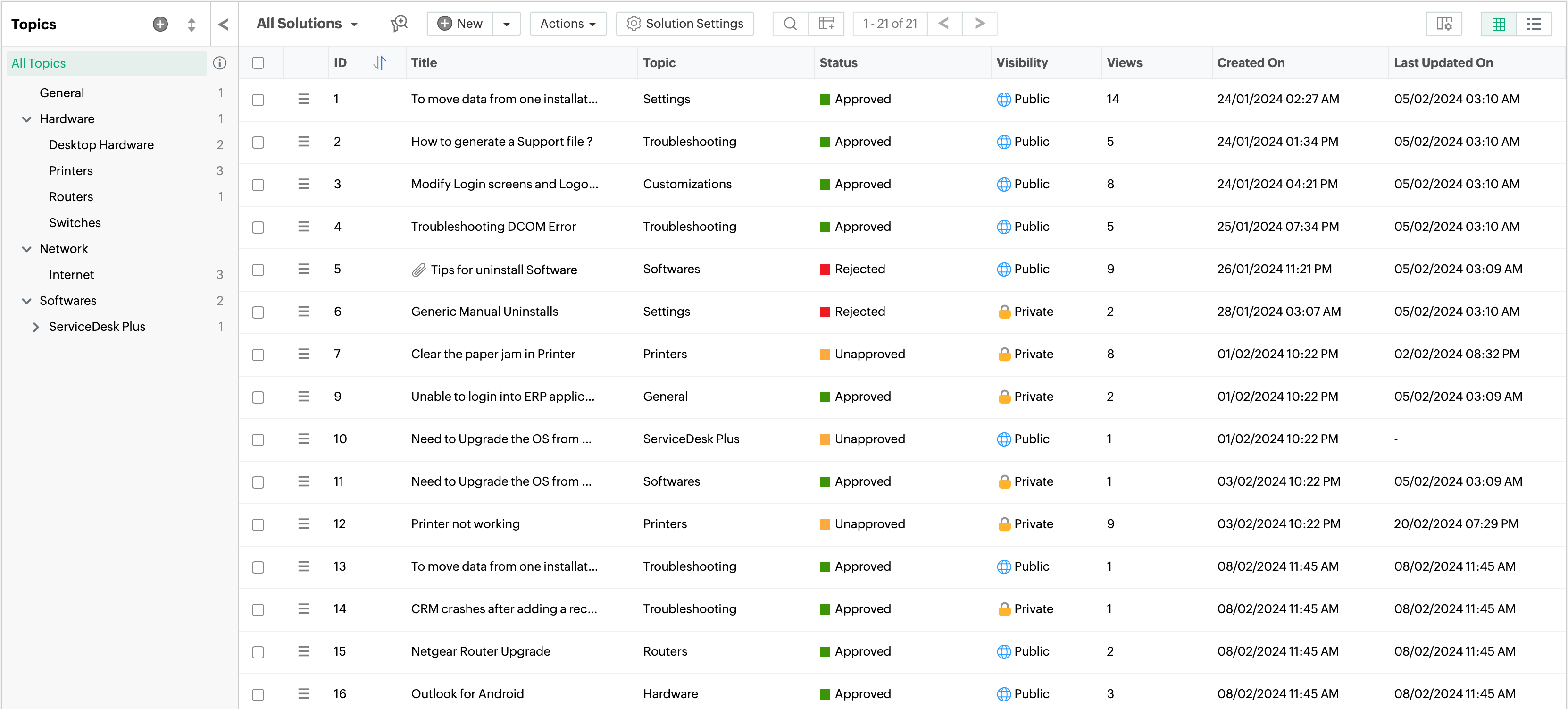 点击工具栏中的 新建解决方案 即可创建解决方案文章。点击该按钮旁边的箭头,可以从 XLS、XLSX 或 CSV 文件导入解决方案。