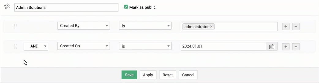 您也可以点击应用,在不保存条件的情况下临时筛选解决方案。除非保存,否则临时筛选器会在页面刷新时被清除。