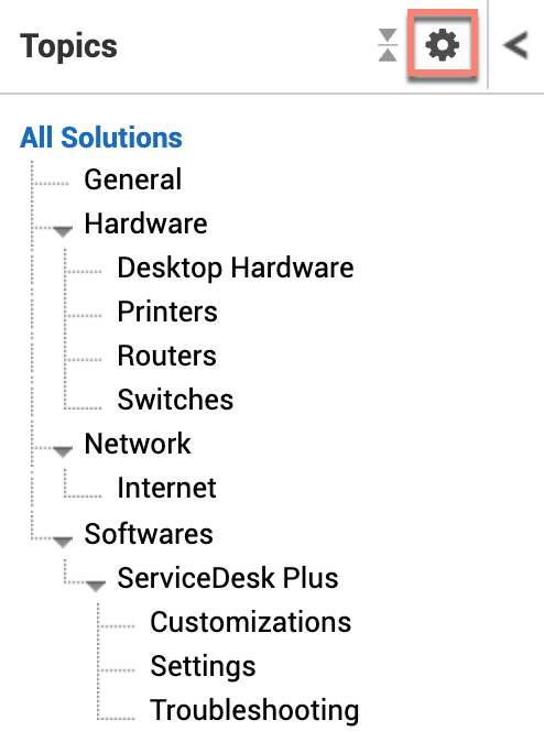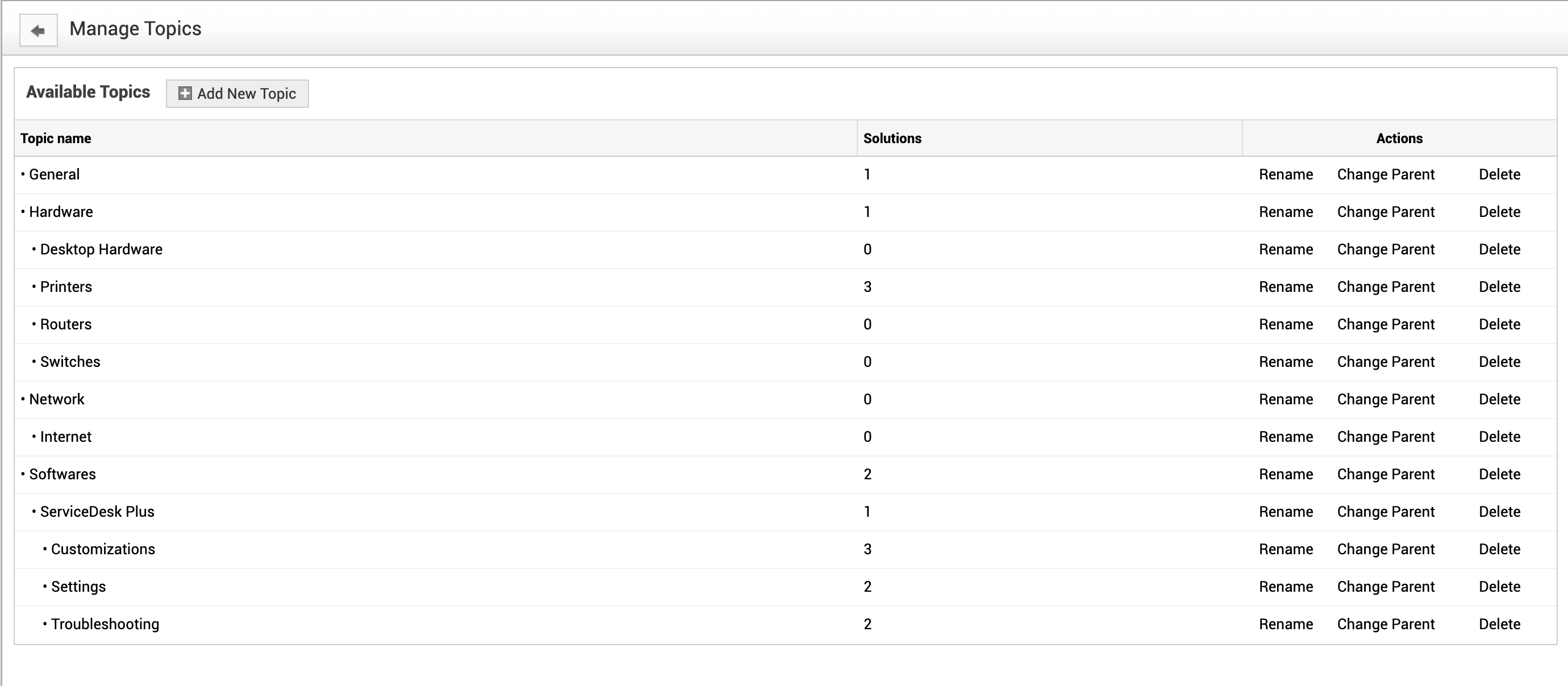 解决方案通常会按主题(及子主题)进行分组或分类,以便能够高效管理。示例:通用解决方案可以归类到名为“常规”的主题下。每个主题还可以进一步包含子主题,另一组特定于该子主题的解决方案可归类在其下。示例:属于 ServiceDesk Plus(子主题)application 的解决方案可以归类到软件(主题)下。