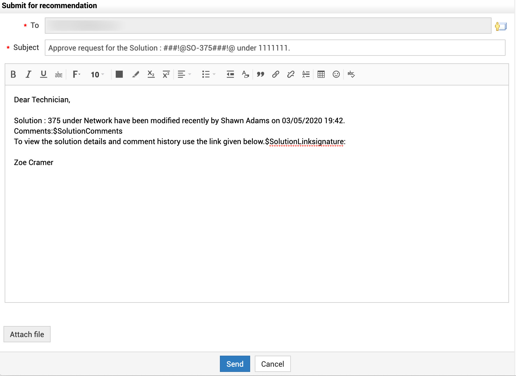 图标,并选择所有需要批准该解决方案的技术人员。 - 主题和说明将按照“通知规则”电子邮件模板中的内容填写。如有需要,您可以手动修改主题和说明内容;或者也可以在帮助台下的通知规则电子邮件模板中进行更改。
