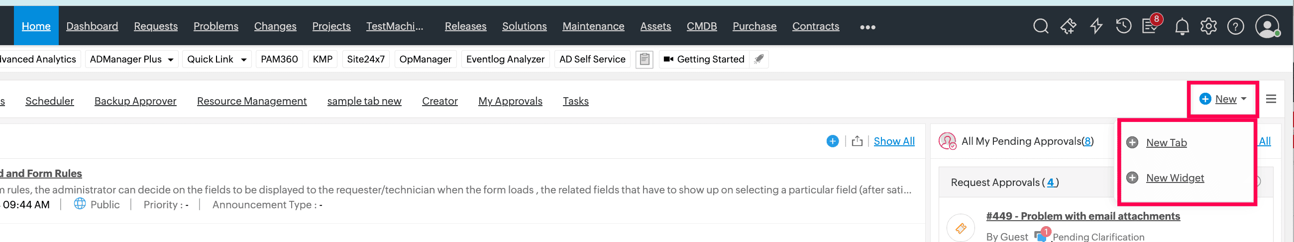 新建选项卡:创建一个新的自定义选项卡,并在技术员主页上显示默认小组件和外部小组件。单击 +新建 下拉菜单并选择“新建选项卡”