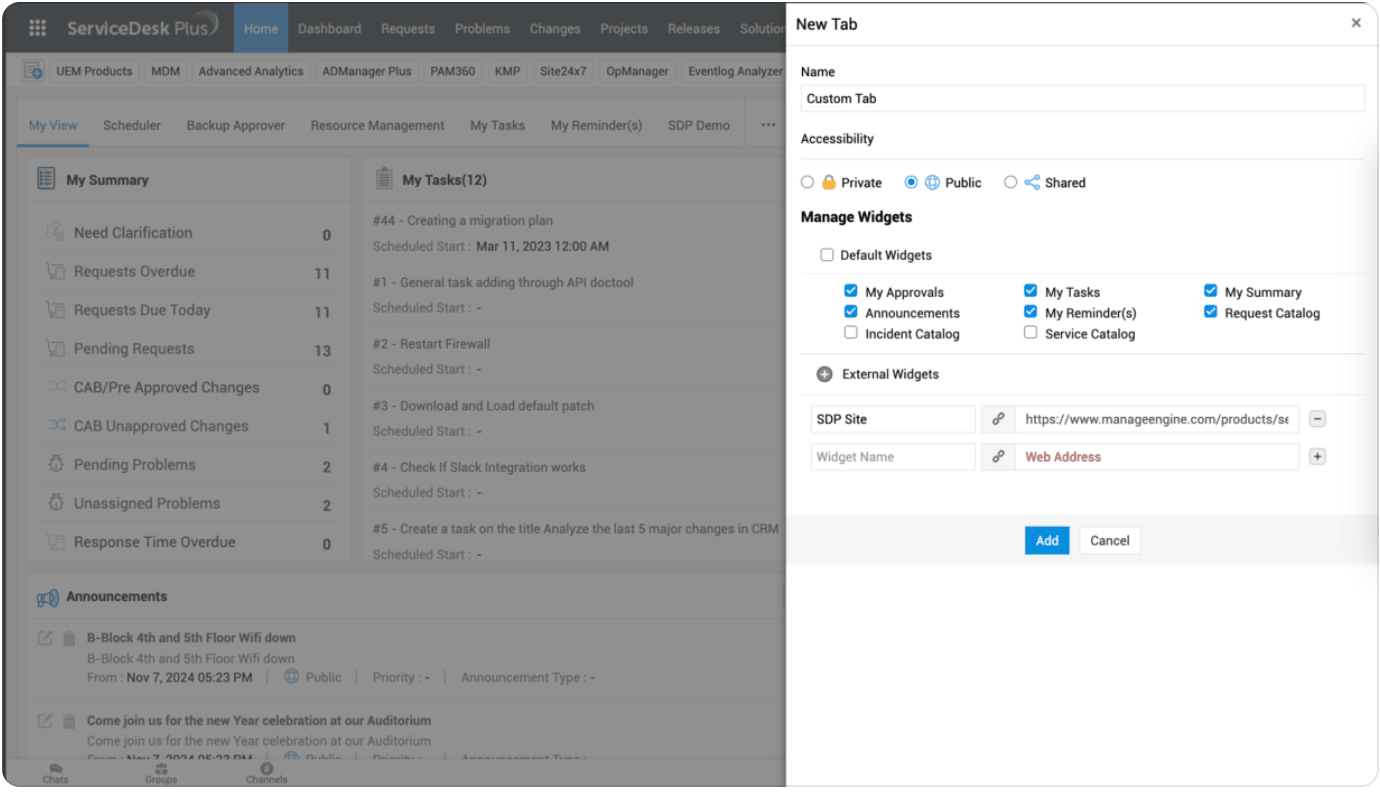您现在可以通过添加/组织小组件、添加新选项卡以及更改布局样式和背景颜色来自定义技术员主页。还可以通过添加外部小组件选项,在主页中嵌入您组织的资源页面或企业内网页面。