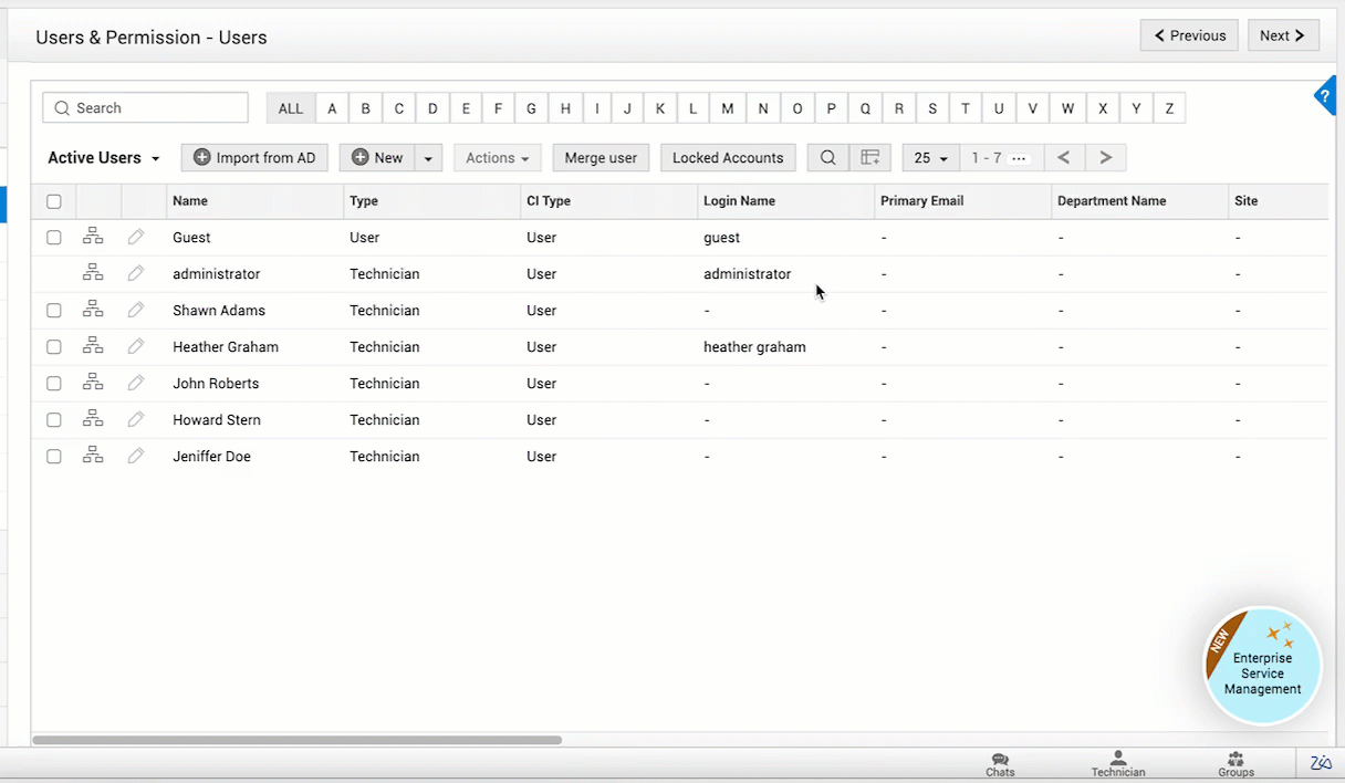 在 ESM 目录 的 用户 下,您可以管理整个组织中的所有用户。您在此处添加或导入的用户 可在组织中的各个实例之间使用。