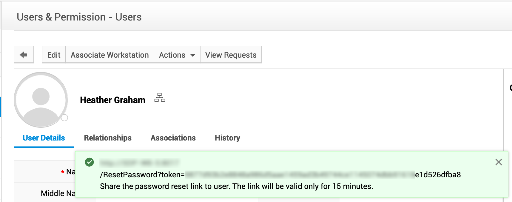 如果未配置外发邮件服务器,或者用户没有主电子邮件 ID,或者用户没有唯一的电子邮件 ID,则不会发送该电子邮件。在这种情况下,系统会向管理员显示一个包含密码重置链接的弹出窗口,管理员可以将该链接分享给用户。