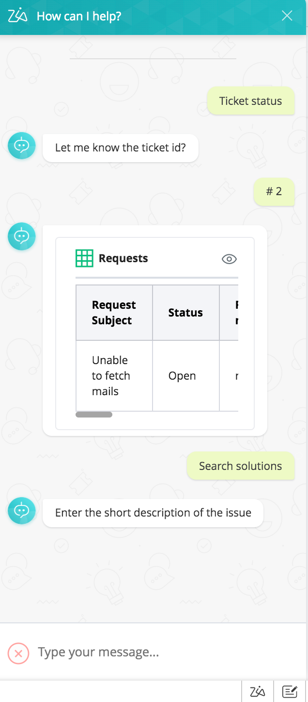 每当用户登录 ServiceDesk Plus Cloud 后,Zia 会每天自动打开一次聊天机器人,并展示当前登录用户的请求摘要。如已启用 快捷操作,用户可直接通过机器人执行操作。否则,显示网页聊天功能。