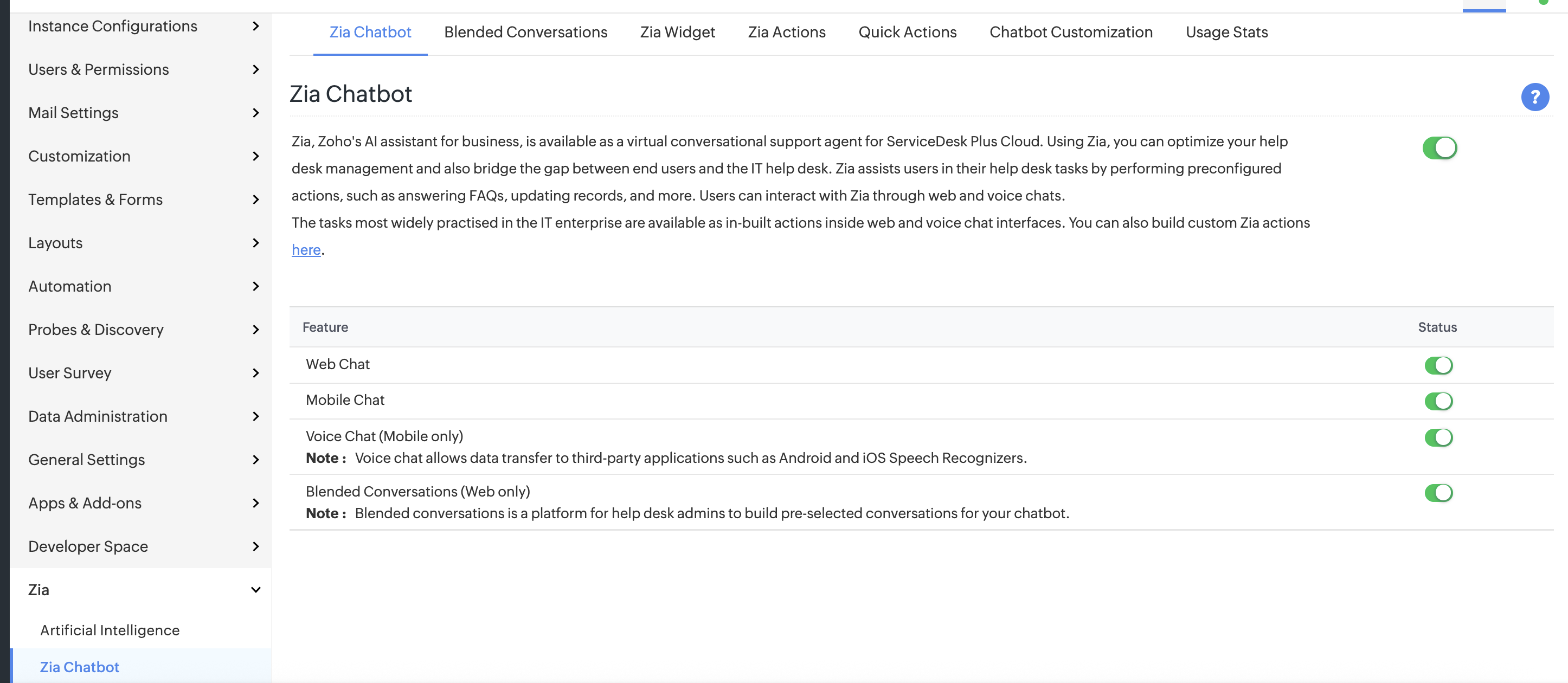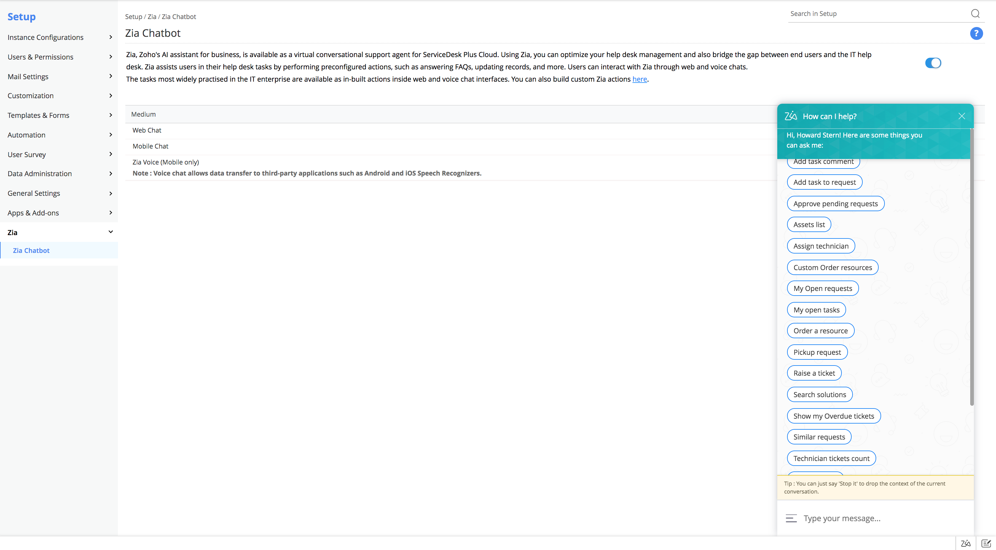 Zia 可用于所有类型的服务台实例——IT 服务台、HR、人事和后勤。创建实例后,前往 设置 > Zia > Zia 聊天机器人。将聊天机器人切换为开启,即可为该实例启用 Zia。
