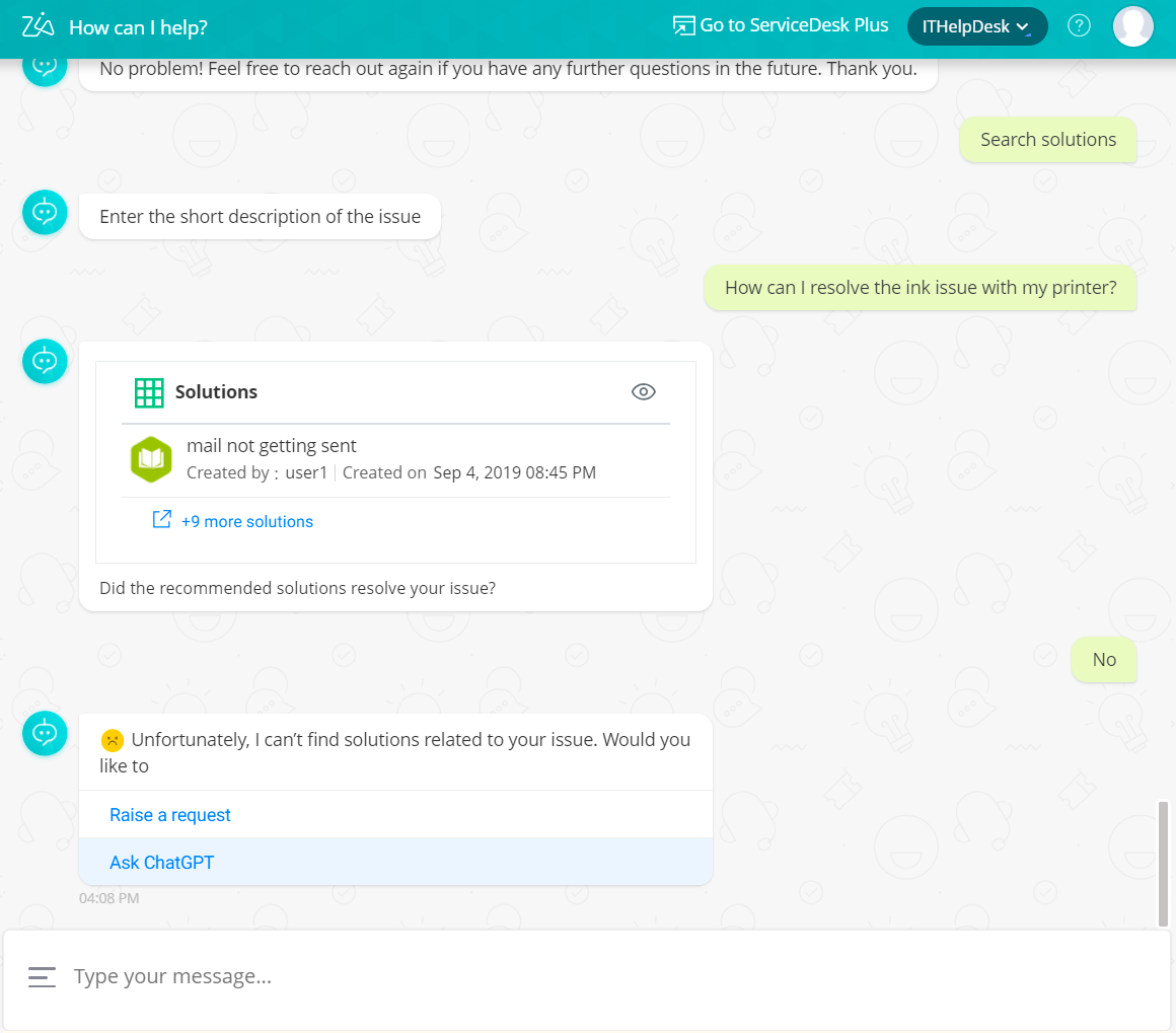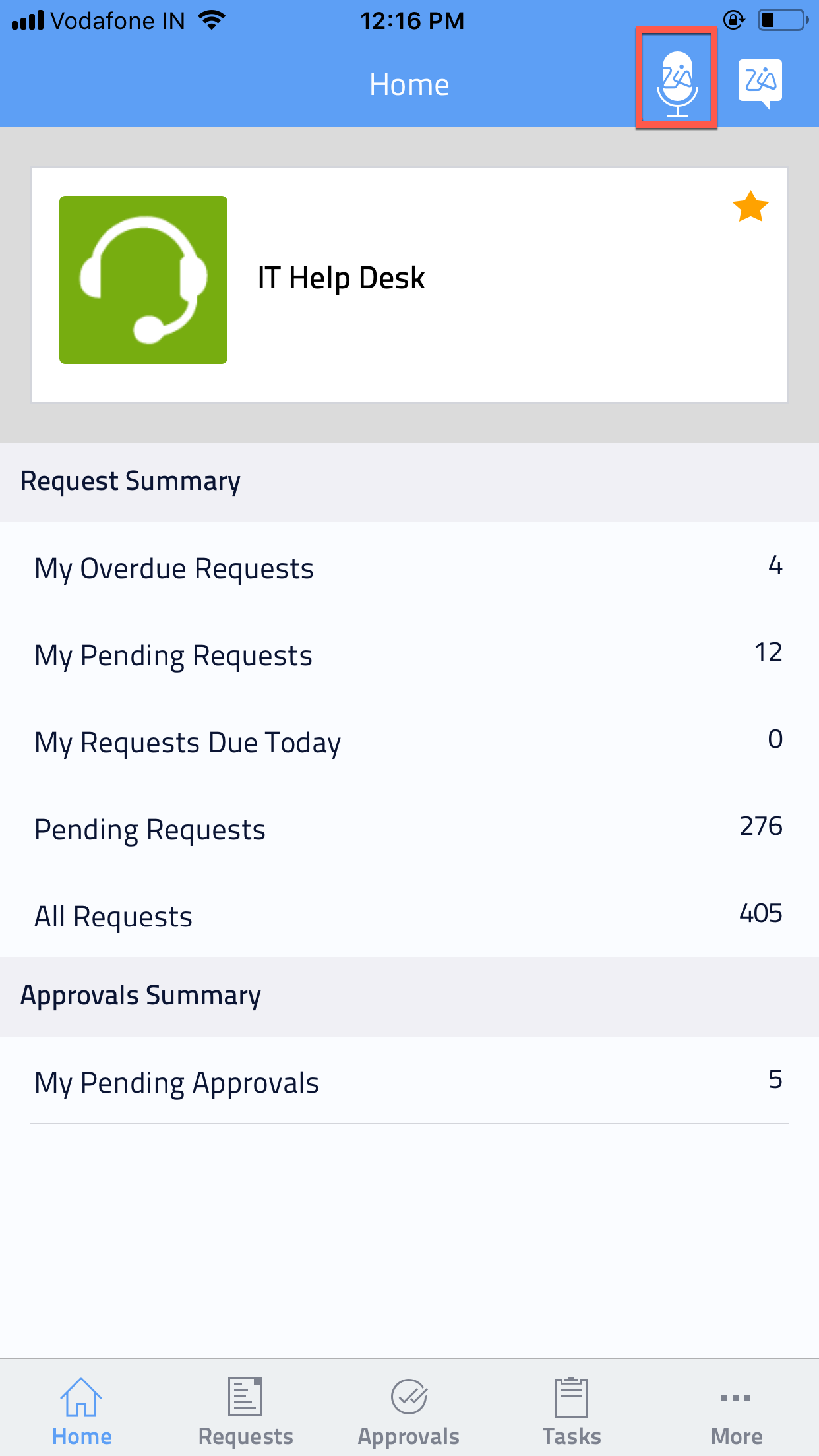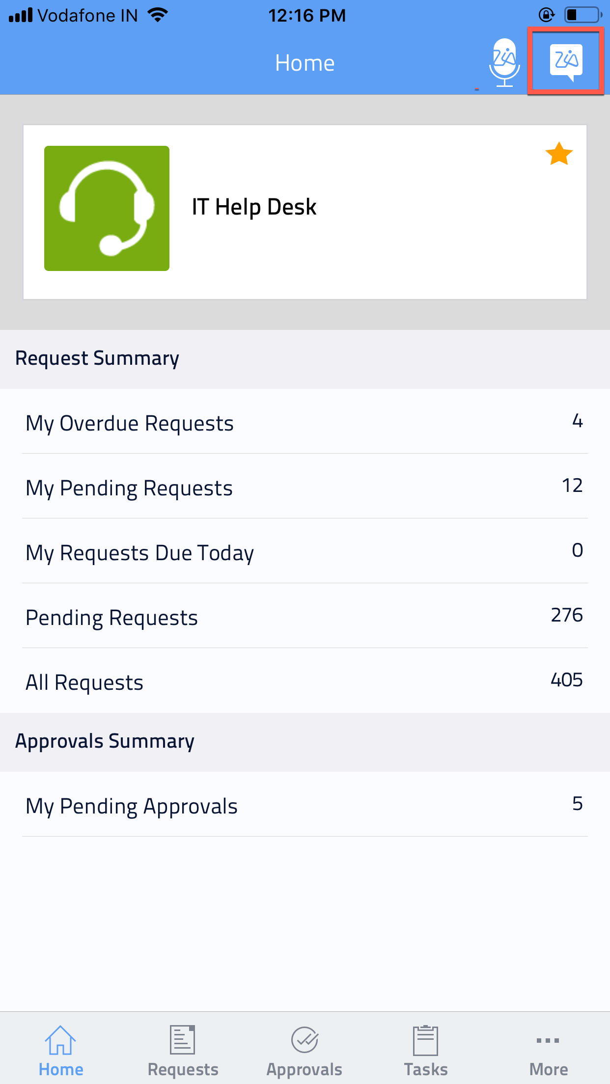 移动聊天:为用户提供移动端聊天界面,可通过安卓或 iOS application与 Zia 聊天。移动聊天入口位于 ServiceDesk Plus Cloud 应用右上角。