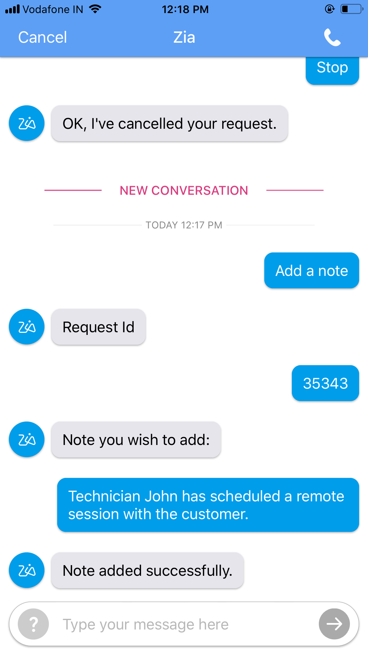 根据实际情况提供所需信息,以便 Zia 完成任务,如下图所示: