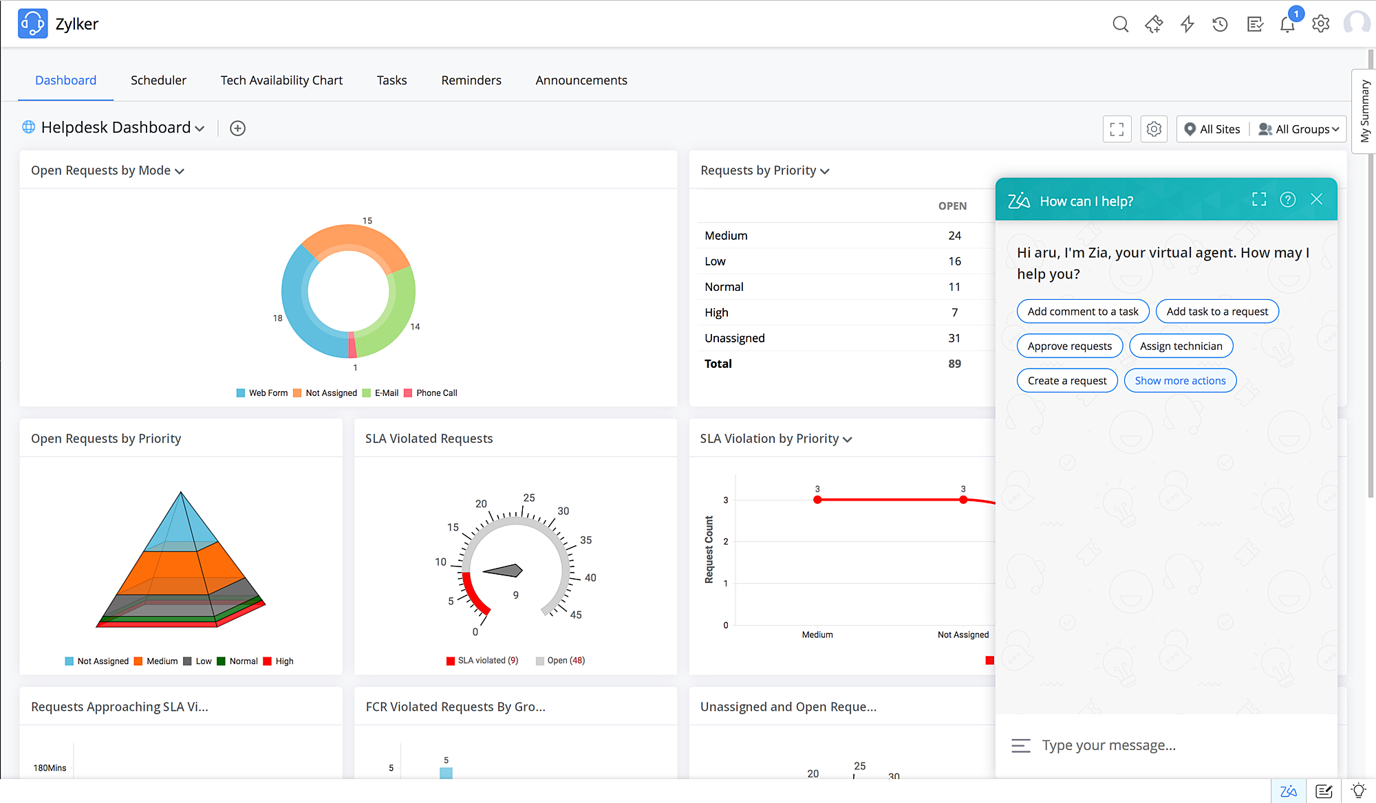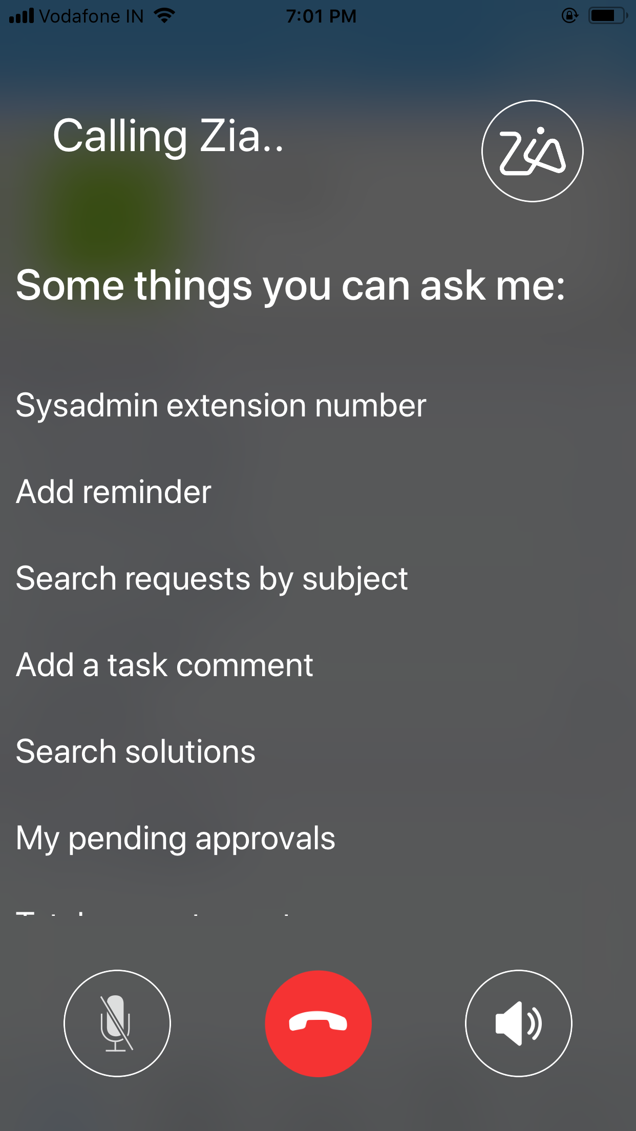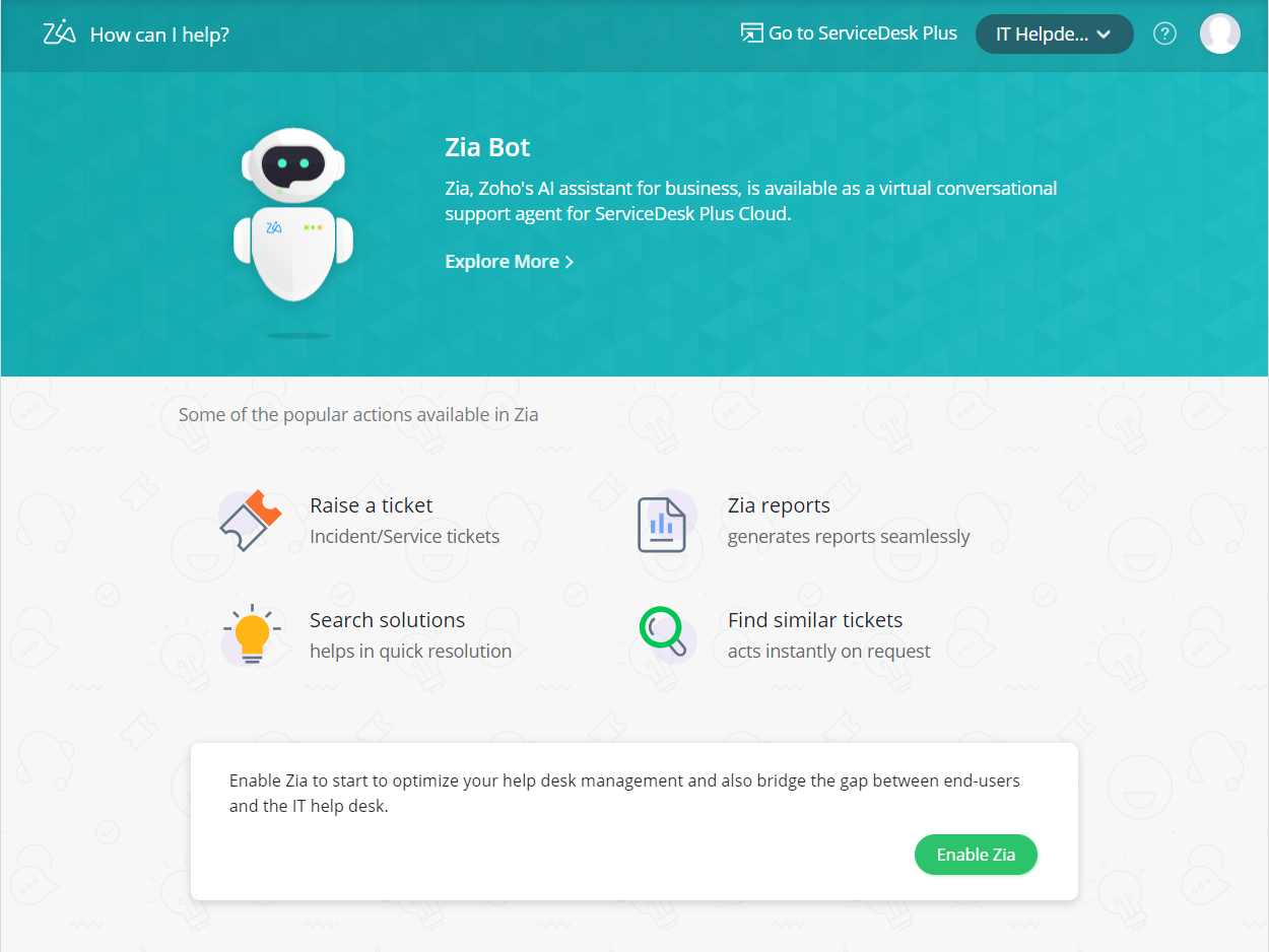 Zia 是 Zoho 旗下专为企业打造的 AI 助手,可作为 ServiceDesk Plus Cloud 的虚拟对话支持代理。通过 Zia,您可以优化服务台管理,并帮助终端用户与服务台之间建立桥梁。Zia 会通过执行预配置的操作来协助用户完成服务台任务。例如,Zia 可以登记请求、添加任务、更新备注、批准请求或获取即时报告。Zia 还能直接回答问题并从application数据库中获取信息。用户可通过聊天与 Zia 互动。Zia 支持语音聊天,帮助用户轻松实现多任务处理。