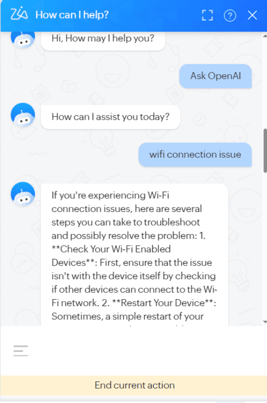 您可以通过聊天与 Zia 互动,获取简单直接问题的即时答案。例如,您可能需要查询本年度放假信息、跟进资产请求,或联系楼宇维护确保空调统一。所有此类直接信息都可通过 Zia 存储及随时答复。