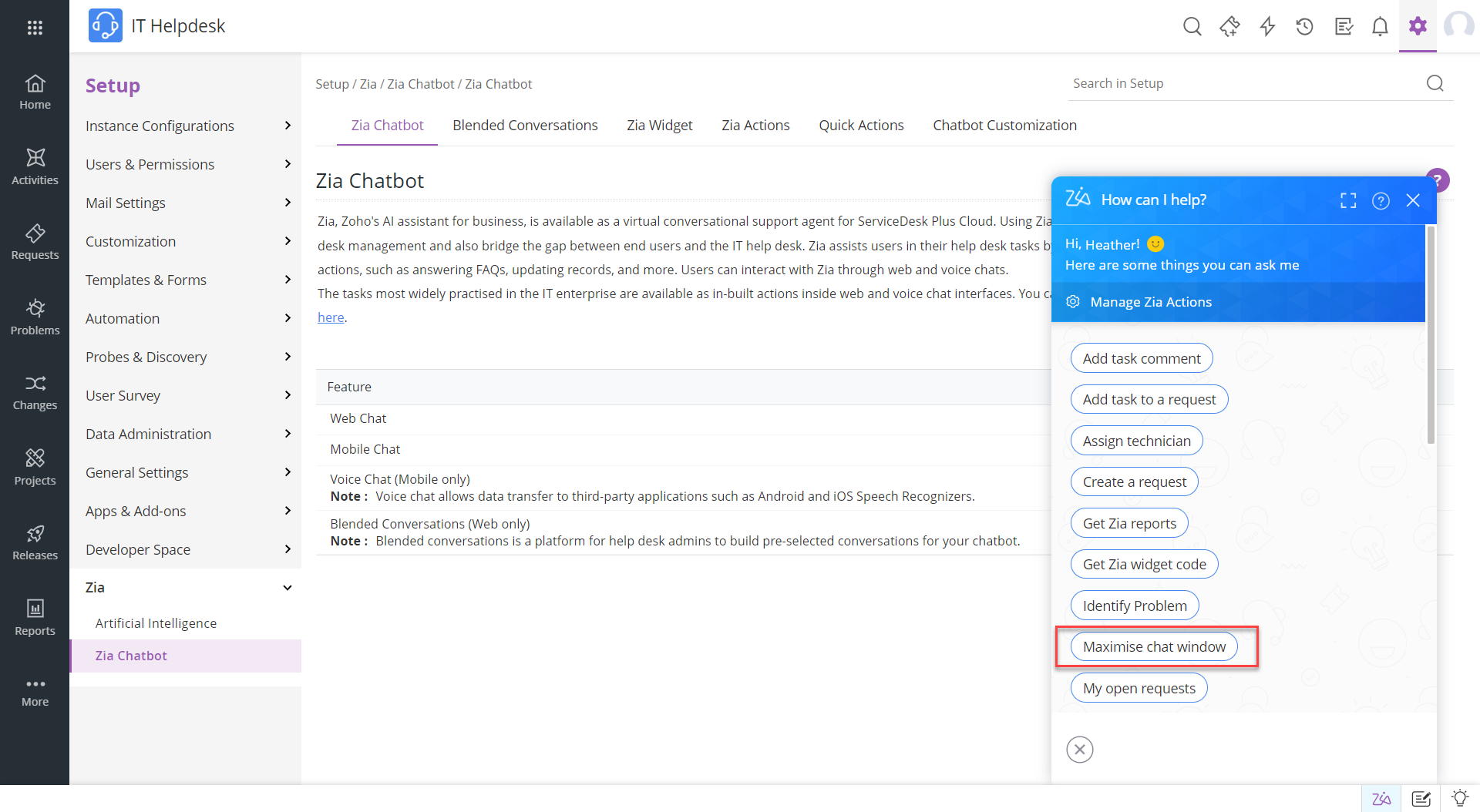 图标,在新的浏览器标签页中展开 Zia 网页聊天机器人。也可选择操作列表中的最大化聊天窗口,或直接在对话框输入“最大化聊天窗口”。