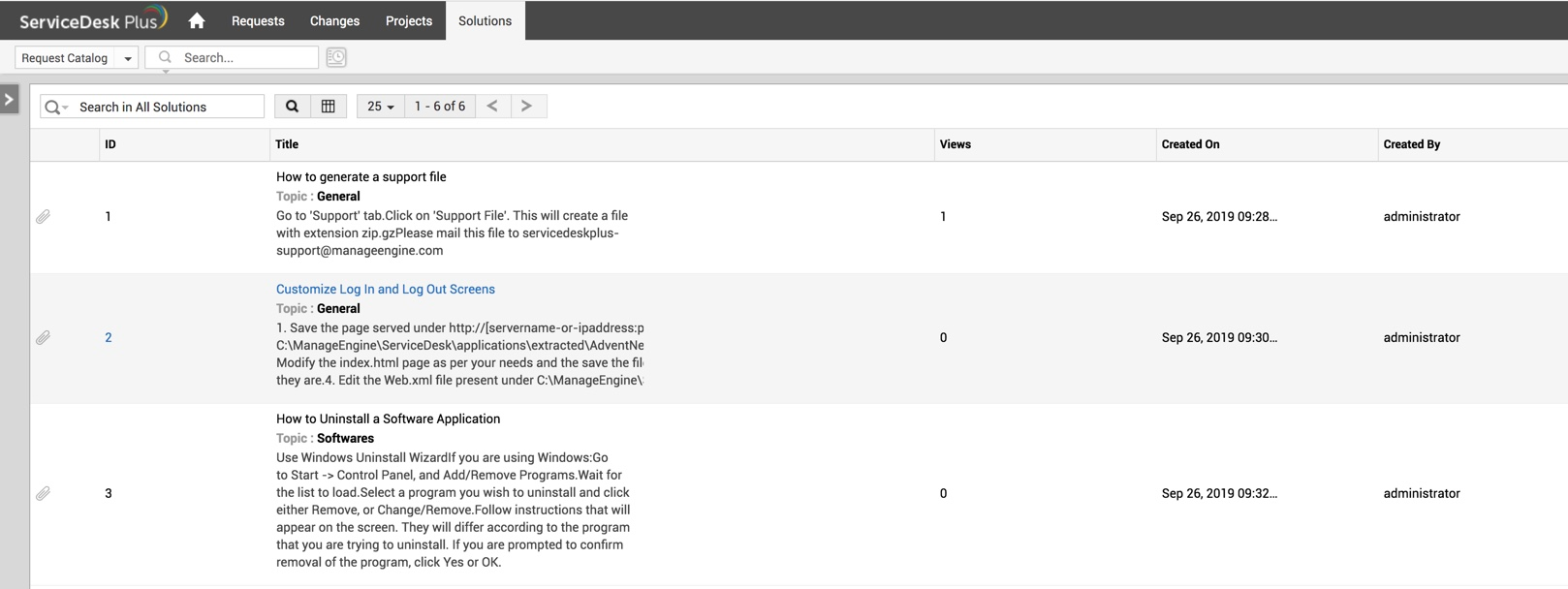 - 使用关键字或主题来查找解决方案。服务台团队会将常见问题的可能解决方案更新到知识库中。因此,你的问题很可能已经有现成的解决方案被记录在知识库里。所以,在提交问题或服务请求之前,请先浏览知识库。