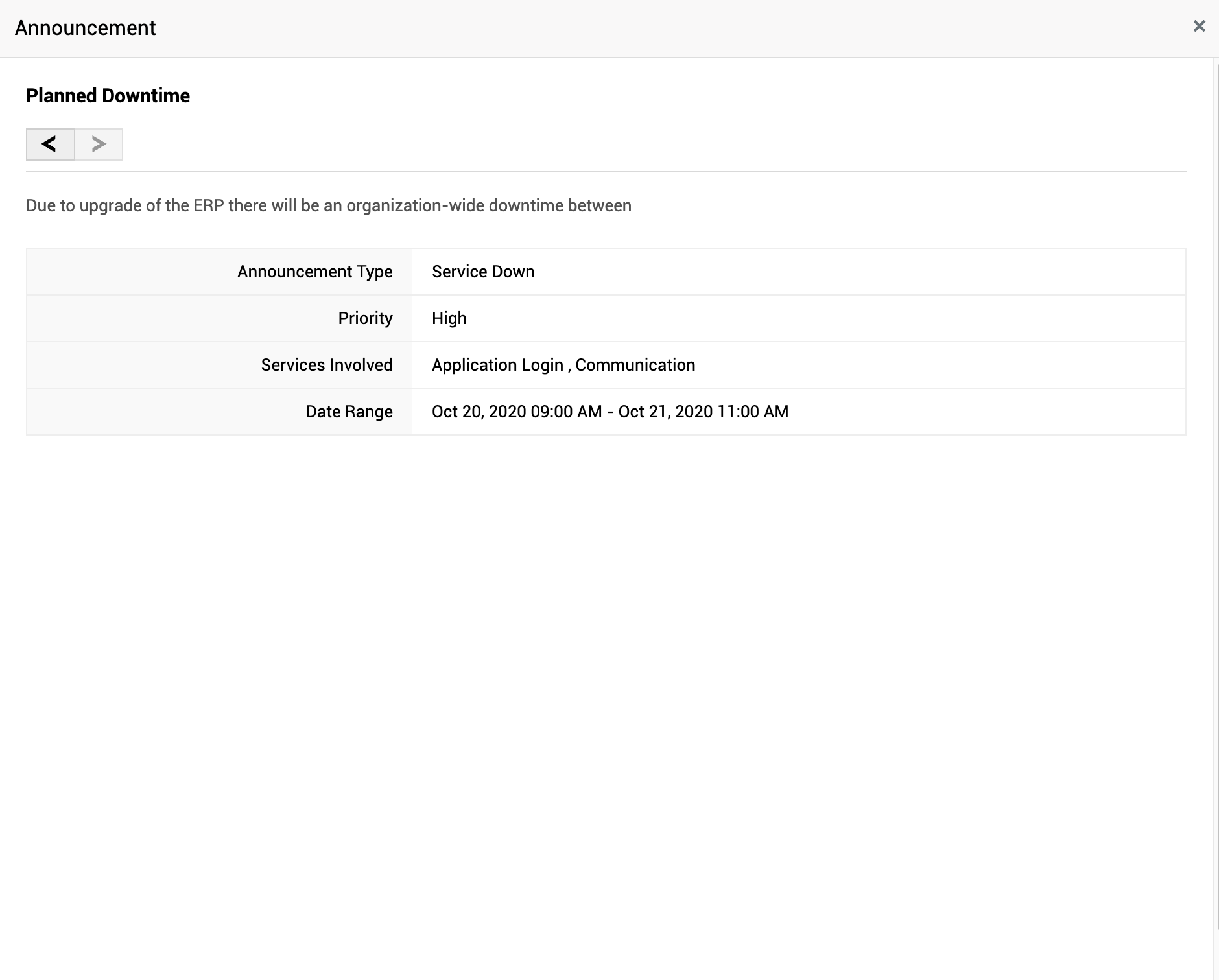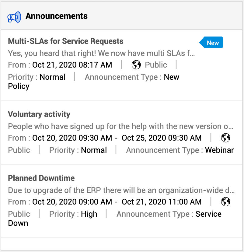 在首页,“公告”小组件会显示所有公司范围内的信息。这些信息可能是关于计划停机时间或服务台发布的任何其他重要更新。