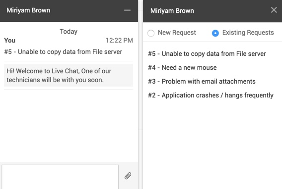 在自助服务门户中,您可以直接与技术人员聊天,在无需创建问题或服务请求的情况下解决您的问题。您还可以就已提交的问题进行咨询。