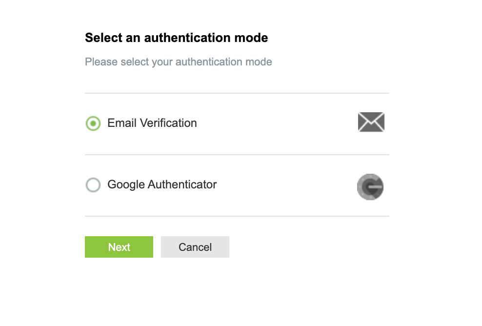 如果管理员已启用双因素身份验证,则您在首次登录application时可以进行注册。管理员可以启用邮箱验证、Google 身份验证器,或同时启用两者。如果两种模式都已启用,您可以在注册过程中选择任意一种。