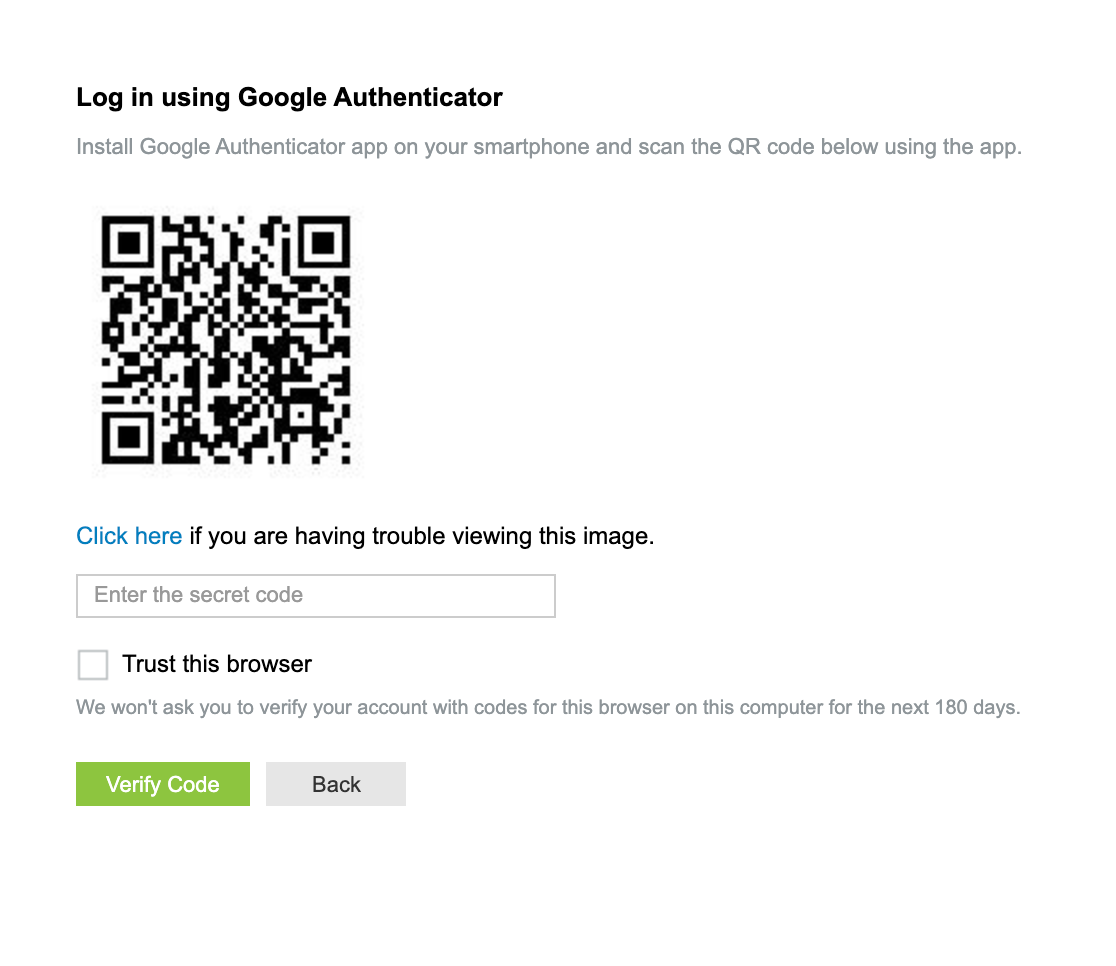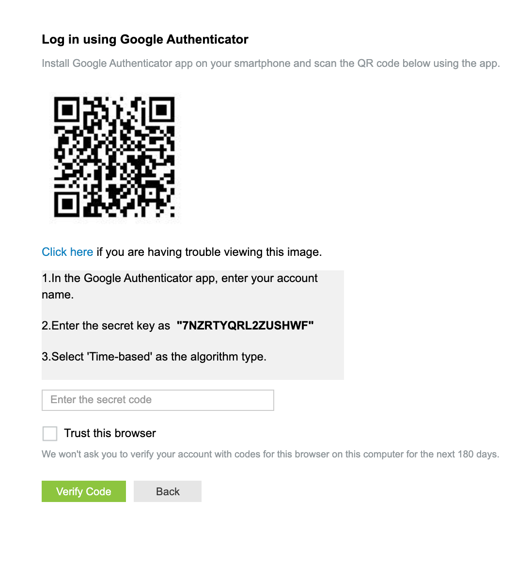 或者,您也可以点击二维码下方的“click here”获取密钥,并将其输入到 Google 身份验证器应用中。