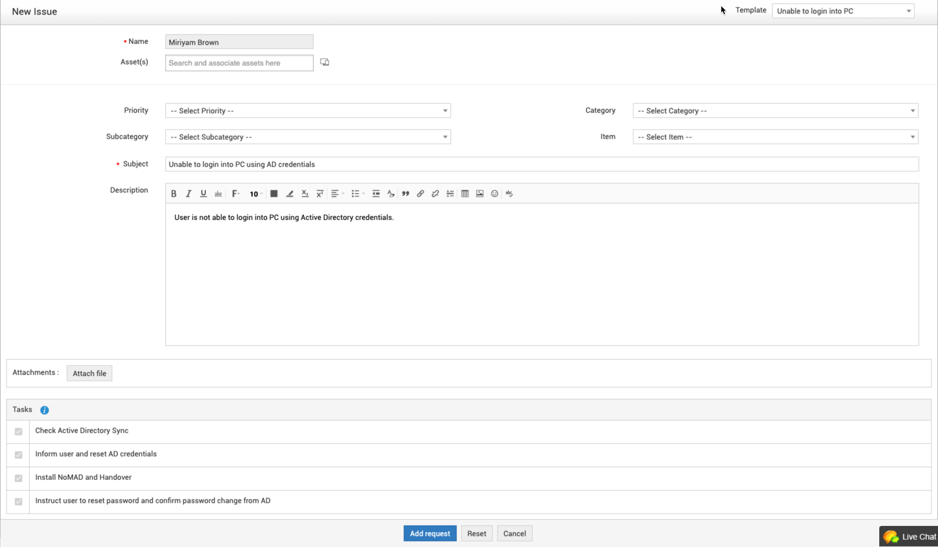 填写必填字段,添加主题,详细描述问题,然后点击 添加请求。