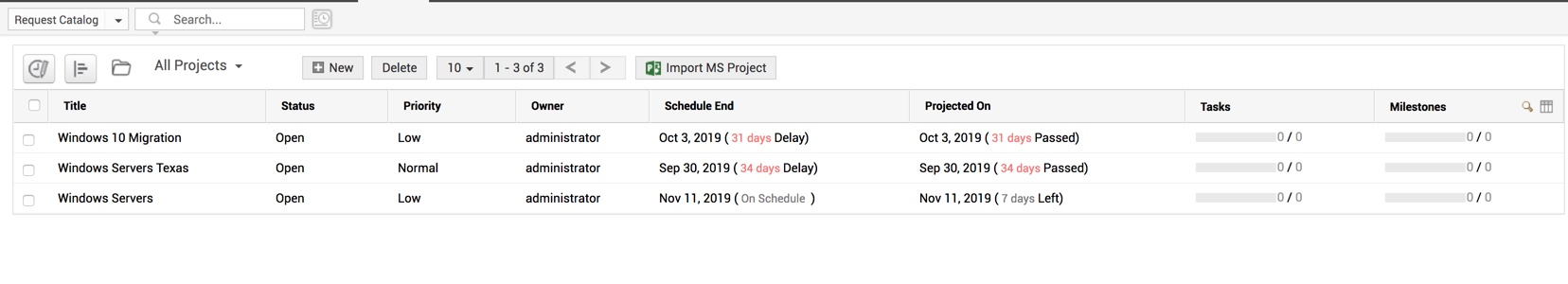 在此页面中,您可以添加新项目,跟踪所有项目及其里程碑,还可以从 MS Project 中导入项目。