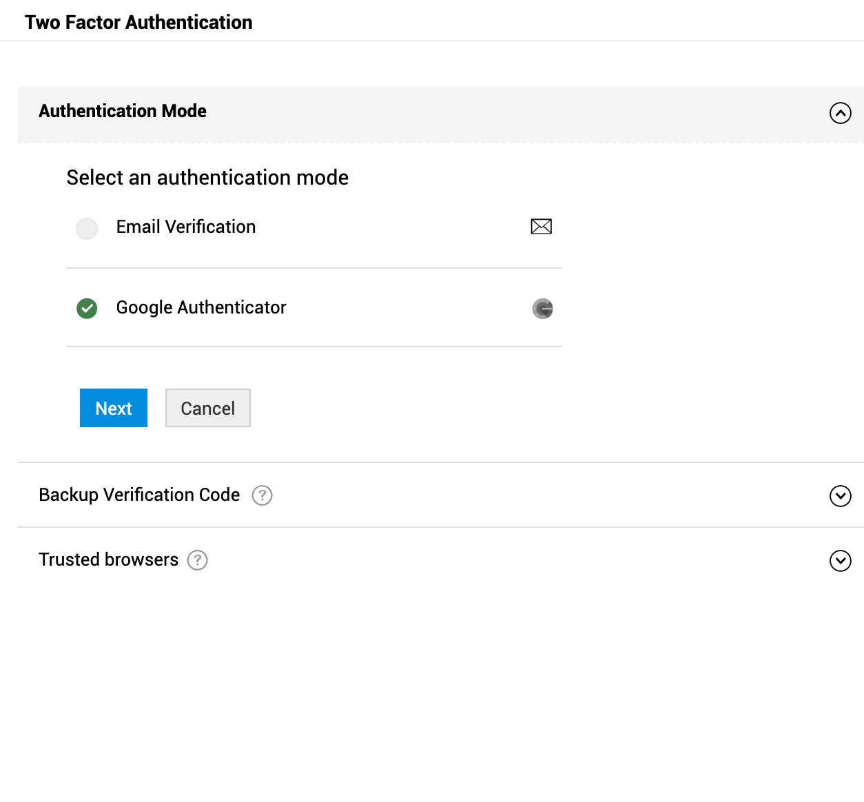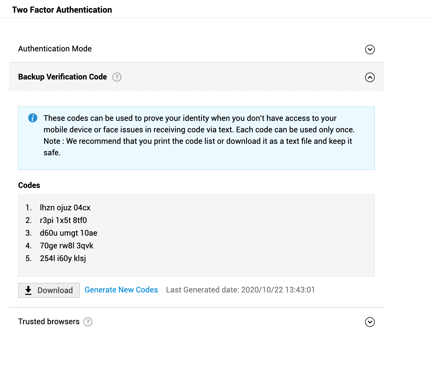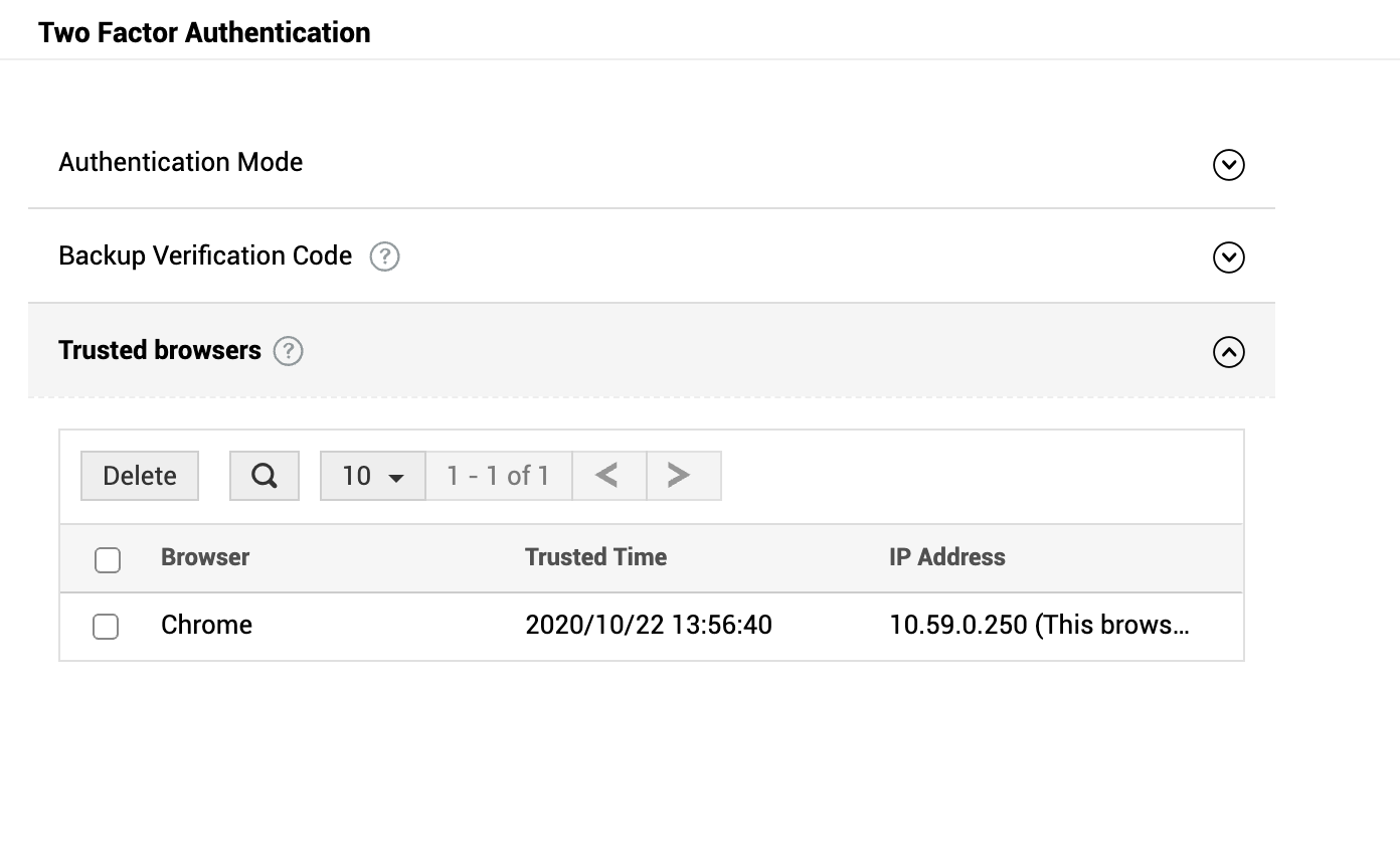 您可以在用户面板中管理受信任浏览器、修改模式,以及查看、下载或生成备用验证码。