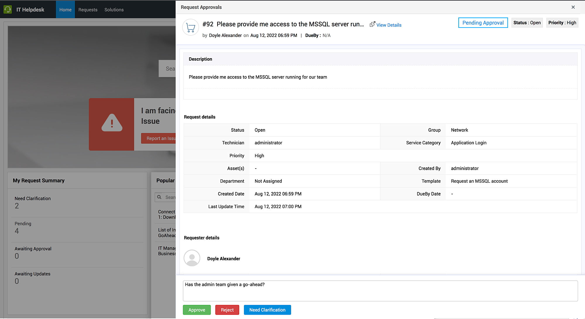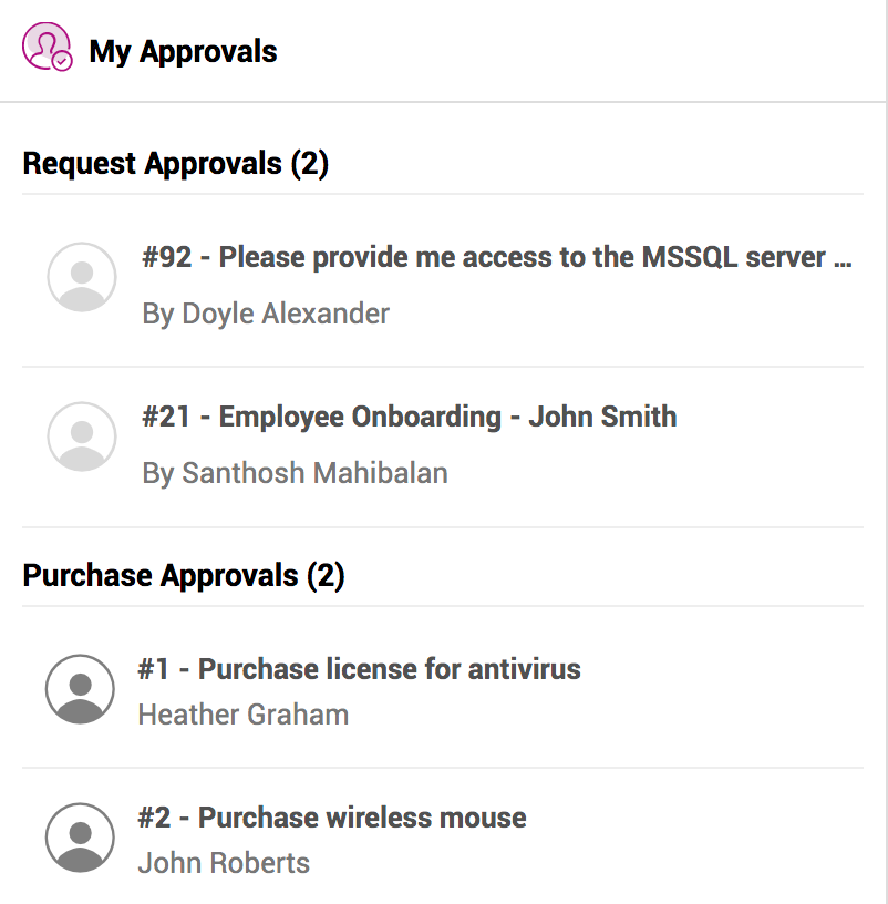“我的审批”小部件会列出所有已发送给你审批的请求。只有当管理员在自助服务门户中配置了该小部件时,你才能看到它。在此小部件下,所有发送给你审批的请求都会被列出。