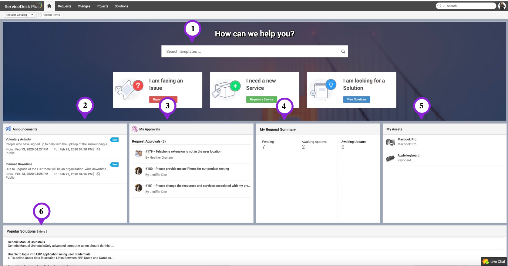 在此页面,你可以记录问题、提交服务请求、浏览知识库以查找解决方案、跟踪你的请求,并访问全公司范围内的公告。