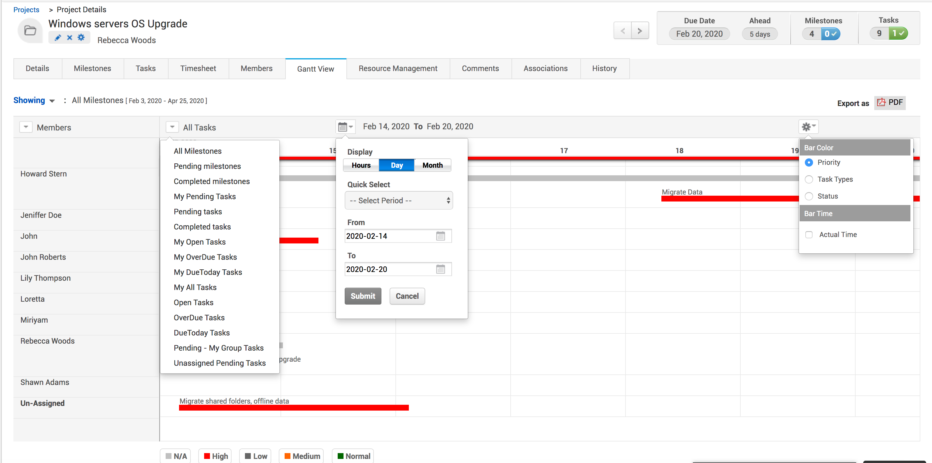 通过快速浏览,您可以按任务、成员和里程碑评估项目状态。