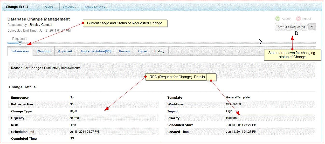 一旦技术员正式提交变更请求 - RFC (Request for Change),请求人将会得到通知,通过通知中的链接,请求人可以访问该变更,查看变更的明细是否与自己当初的变更初衷一致。