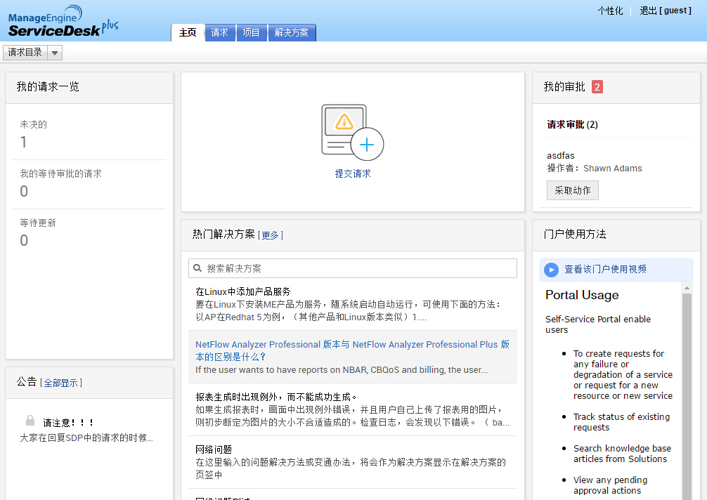当作为一个请求人登录到ServiceDesk Plus之后,将会看到主页,在主页中,将会显示很多有用的信息,您也可以在此进行必要的操作。根据管理员的配置,在主页中可以使用以下功能: