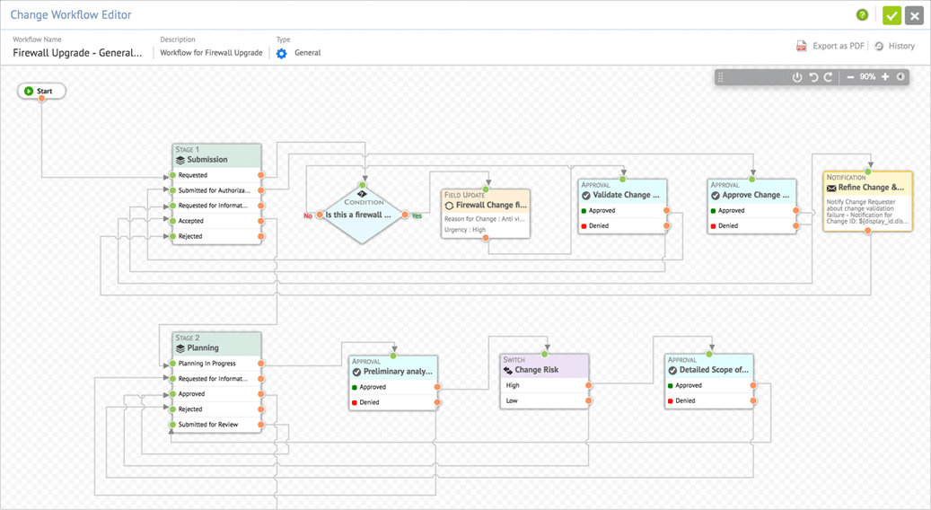 通过在更改的生命周期中添加通知、 字段更新、批准、条件和切换等操作,获得对更改流程的更多控制。