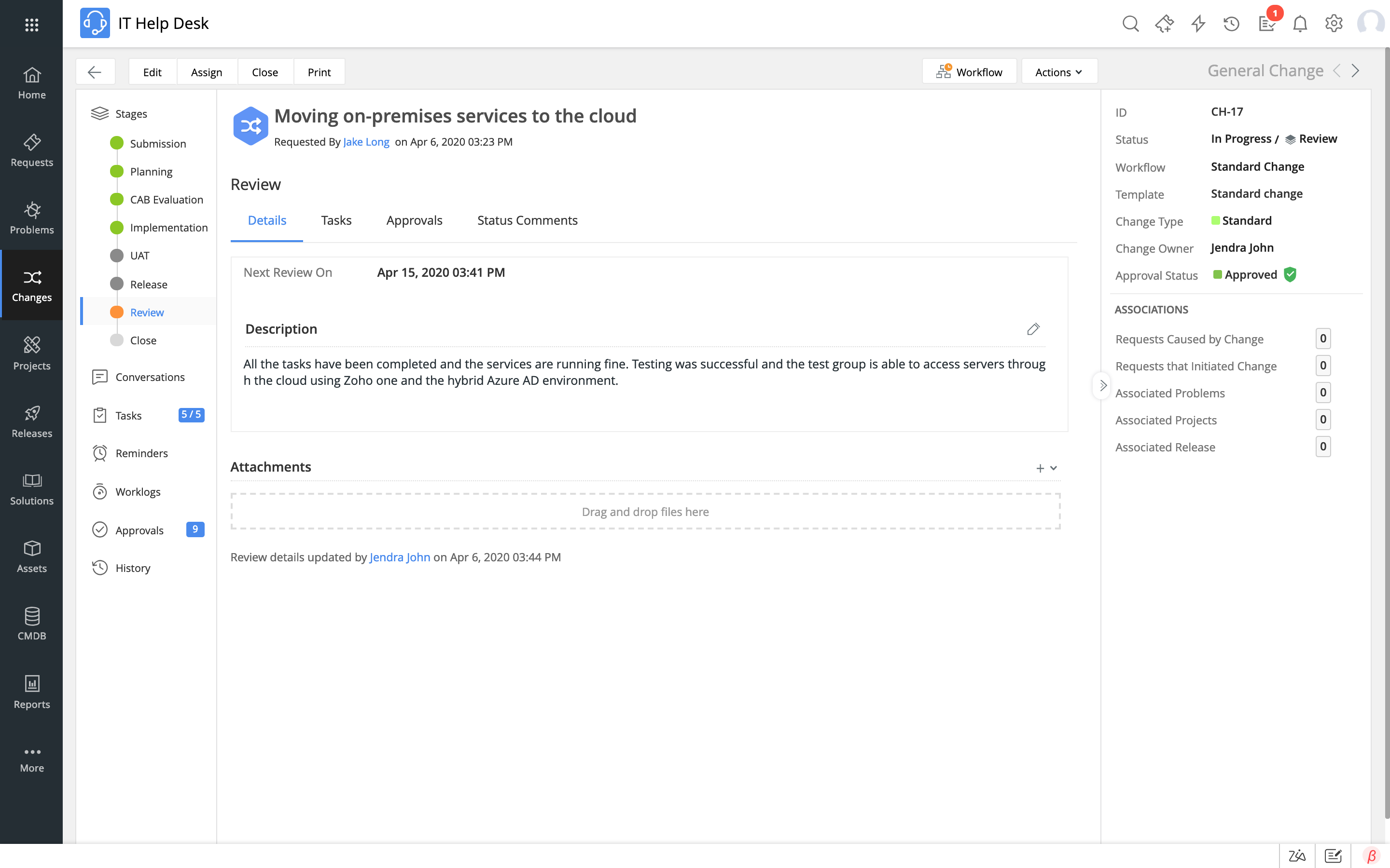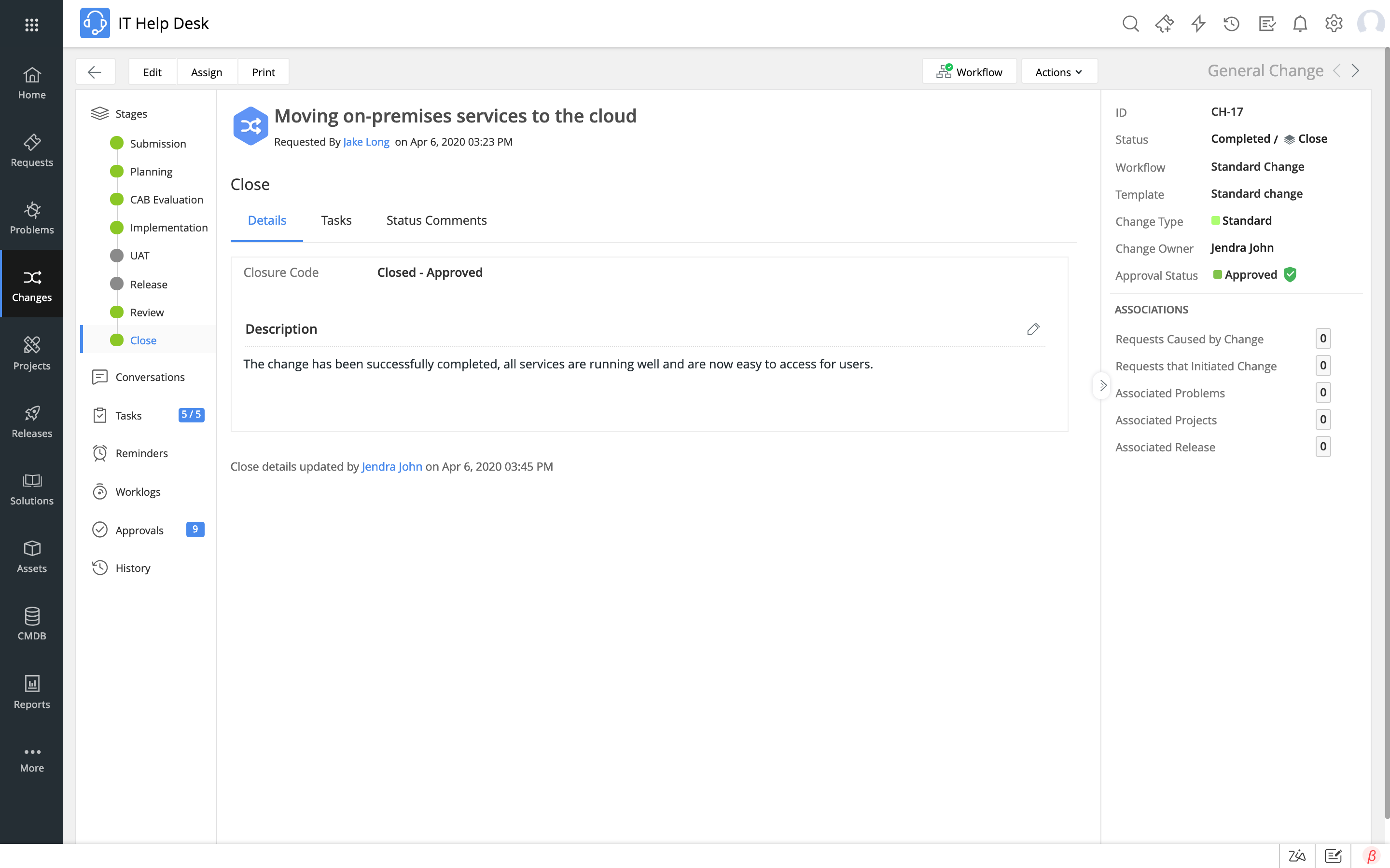 变更管理将使您更好地控制您的变更过程,并帮助您以最小的风险实现变更。通过遵循标准流程,变更管理确保每个变更的所有方面,例如计划、风险评估和跟踪实施,得到有效的管理。利用服务台工具跟踪从开始到结束的变更可以产生奇迹,并使组织能够更好地管理其IT基础设施,实现良好的计划和执行变更。