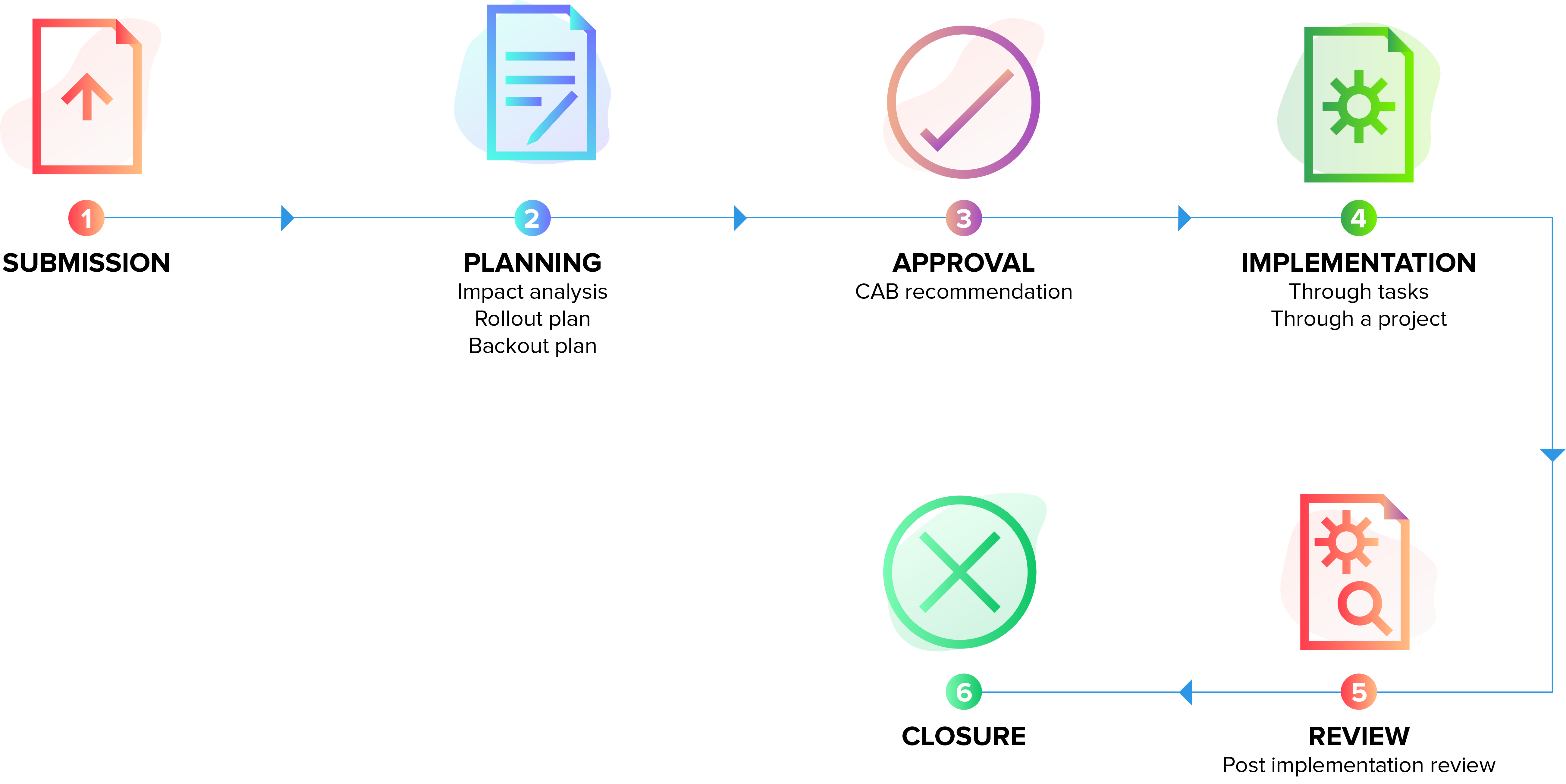 现在让我们看看如何在您的组织中实现变更管理。第一件事是建立一个有效的变更过程,使您能够计划变更,获得必要的批准,并实现变更。下面是一个您可以遵循的变更管理流程,以有效地处理变更。