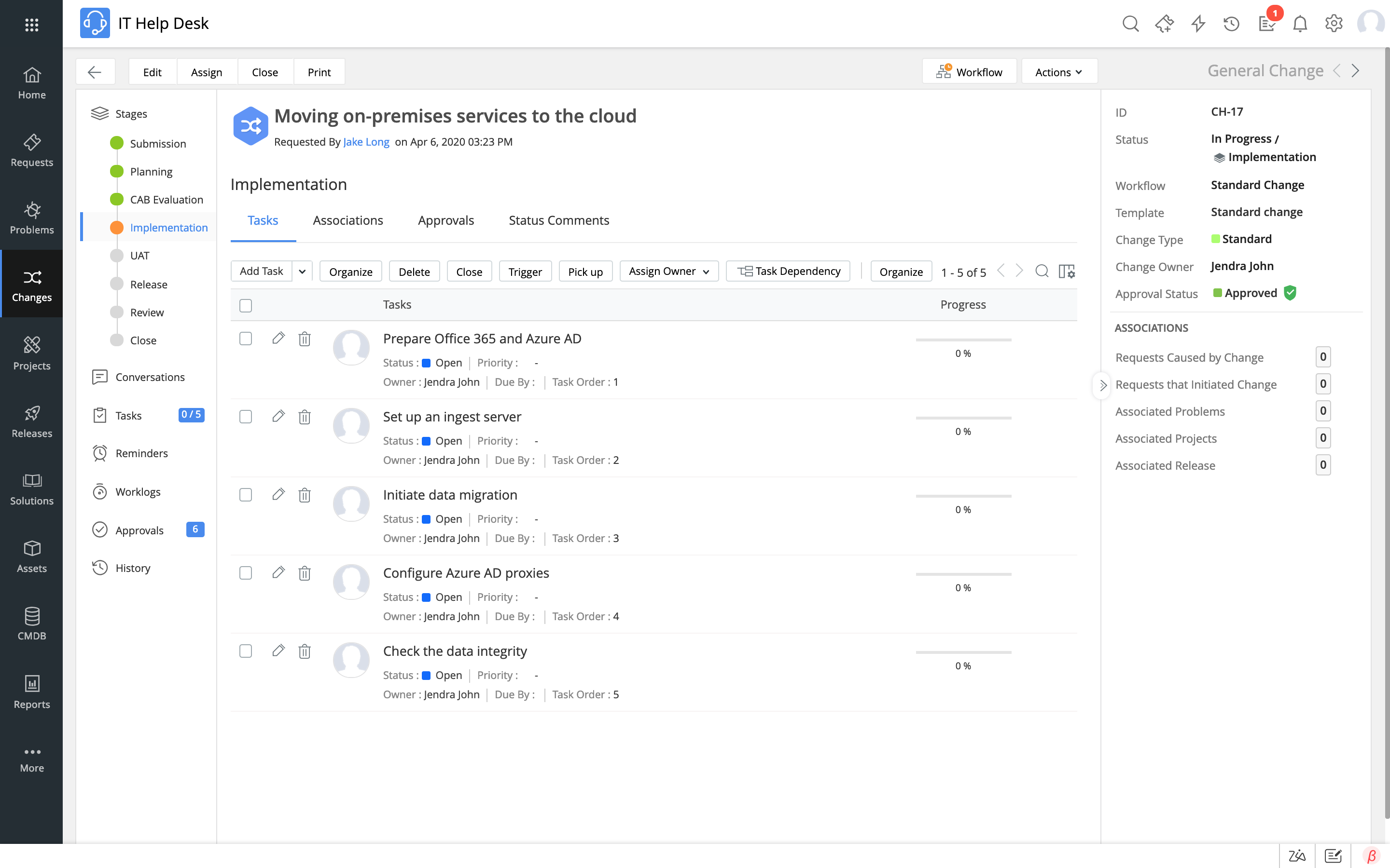 Zylker利用任务来跟踪实现。任务被分配给不同的技术人员,需要完成任务的顺序是使用任务依赖项定义的。变更所有者可以轻松地跟踪变更实现的进度,并在一个地方管理所有任务。