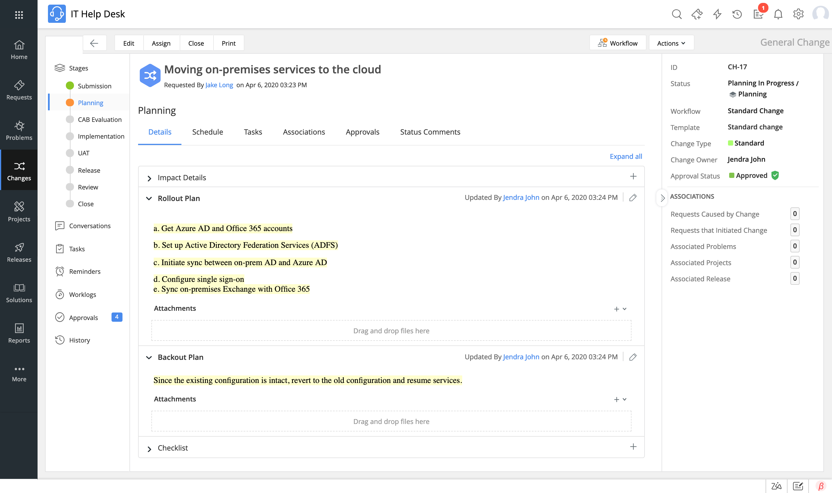 接下来,变更发起者添加变更信息,例如变更的原因、影响的详细信息、推出和取消计划,以及计划的停机时间。变更发起者还添加了所有相关的事件和问题,以更好地跟踪变更及其影响。下面是变更发起者提出的各种计划。