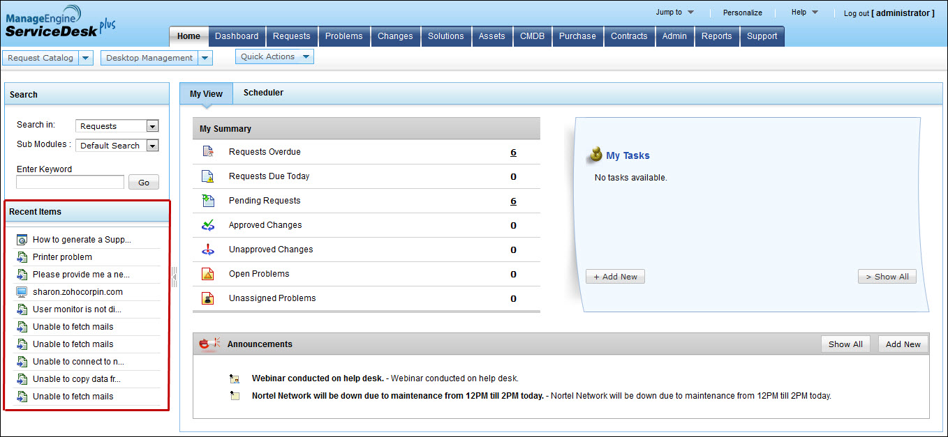 Recent Items displays the list items that were recently accessed by the user. But as the number of users increase, displaying and managing the list of recently accessed items for each user can hinder the performance of ServiceDesk Plus. [