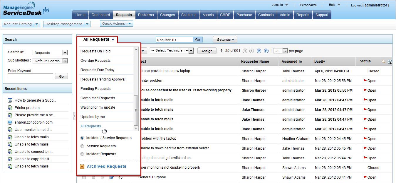 The 'All Requests' filter in the request list view displays all the requests that have been created so far, irrespective of the status. But as the number of requests increases, the performance of ServiceDesk Plus gradually slows down. [