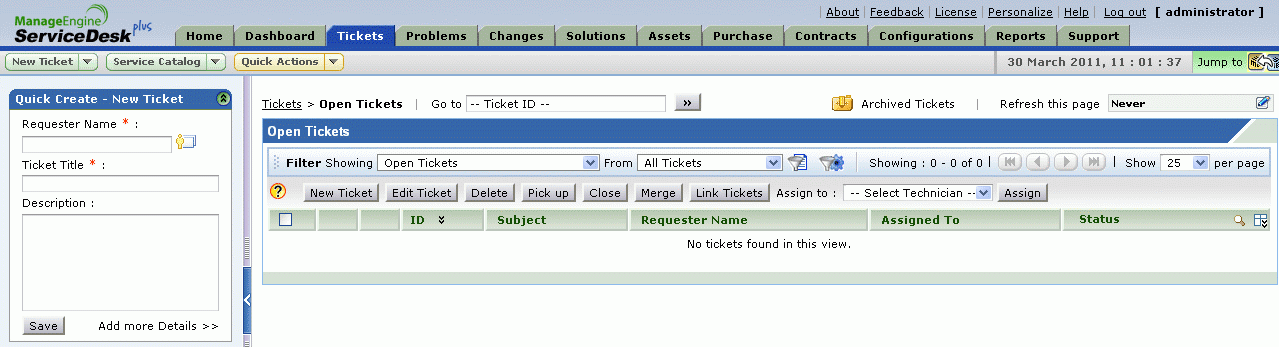 Screenshot ] - Start ServiceDesk Plus Server. When you login, you would see the Requests being displayed as Tickets and Admin being displayed as Configurations. [