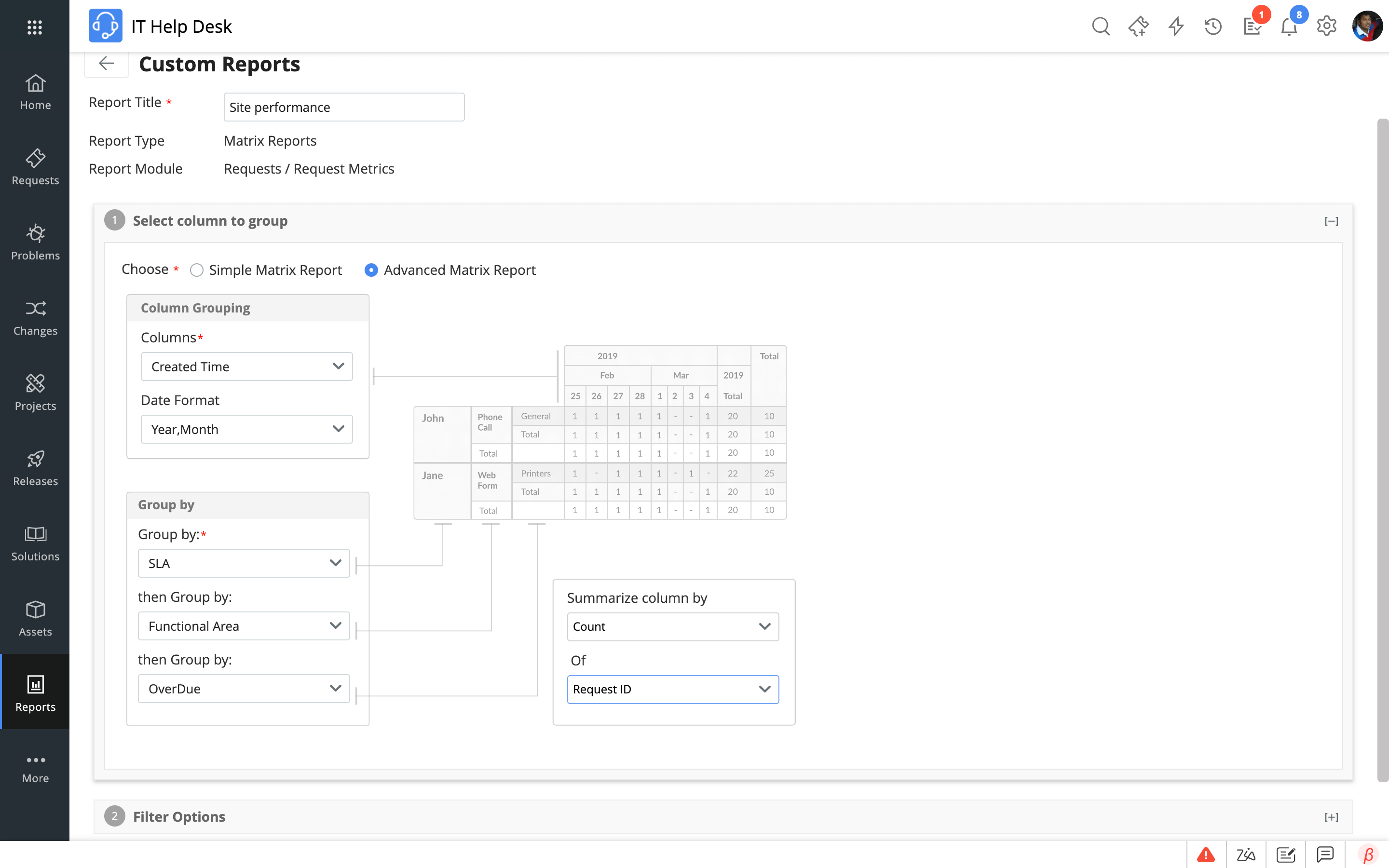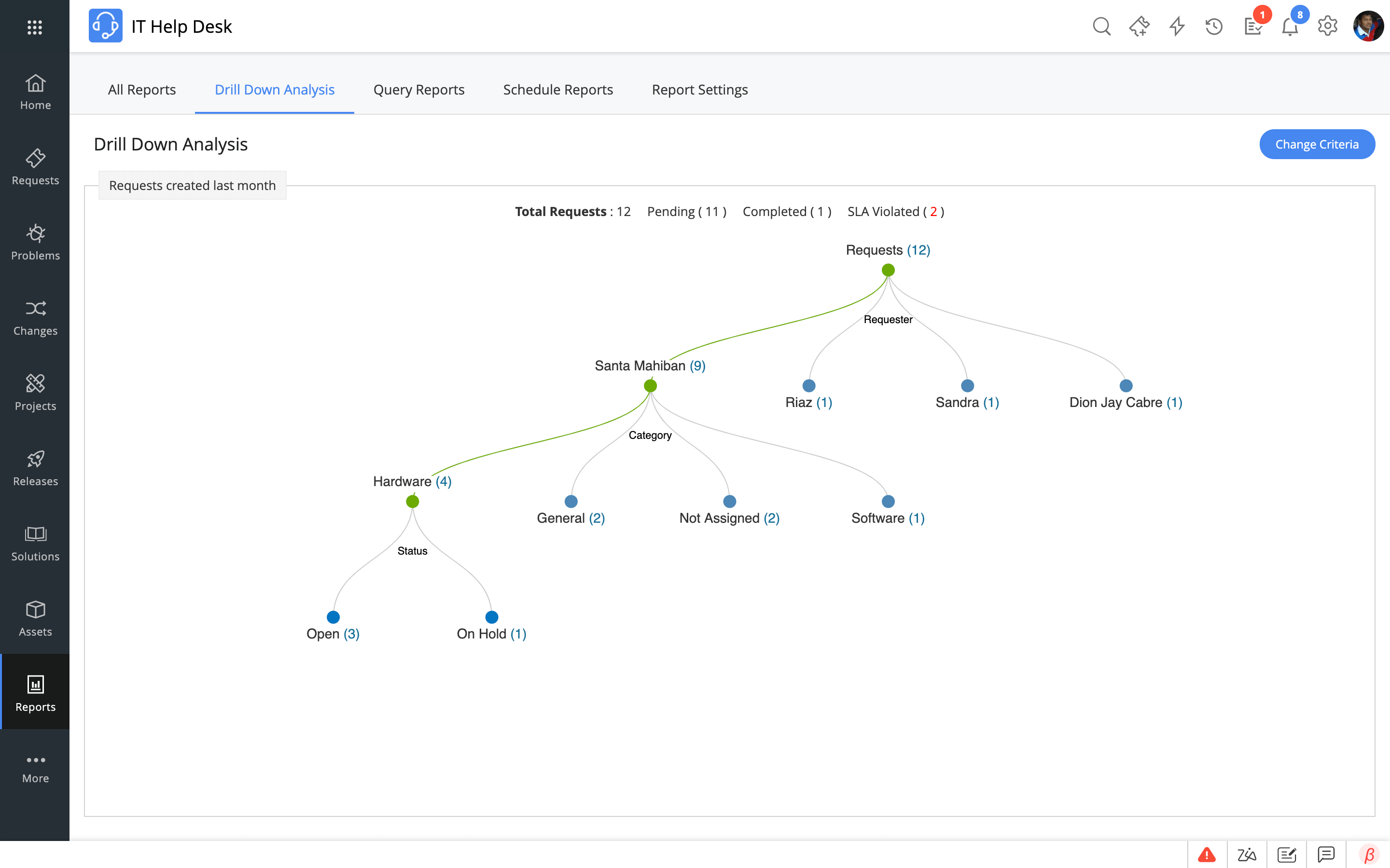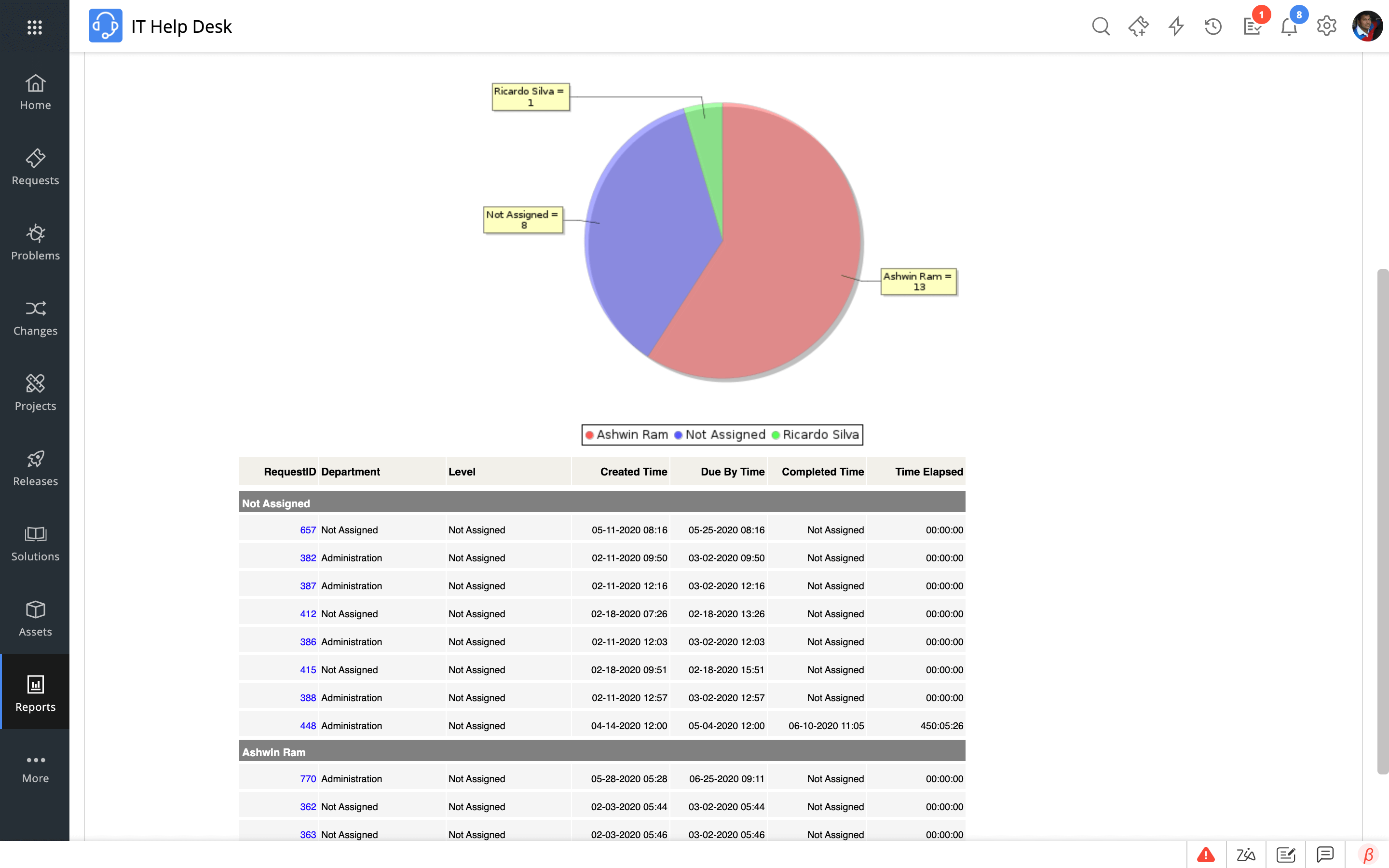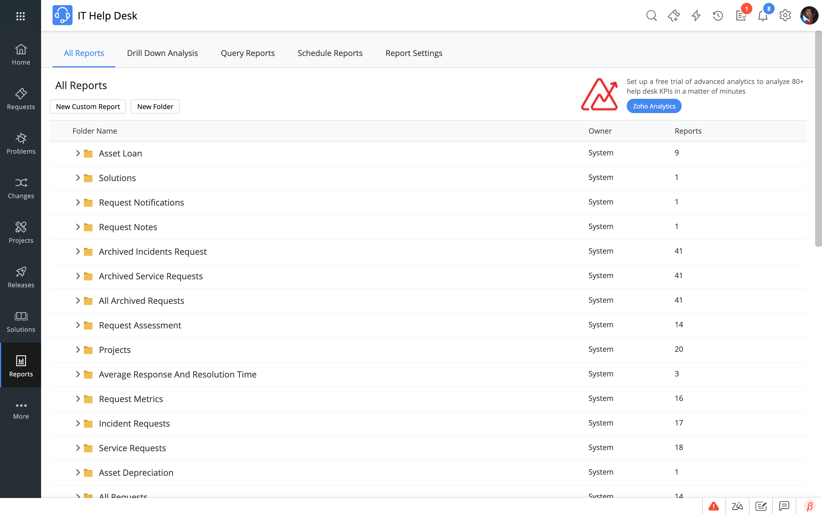 IT 服务台报表是一项基本的IT 服务管理 (ITSM)实践;它帮助组织收集、分析和提供洞察力,否则这些数据会被忽视。报表可以显示服务台在实现目标方面的有效性,并帮助您了解更好地实现目标的方法。它们还使您能够在任何给定时间跟踪特定流程的状态。这些功能使诸如庞大的报表、无数的电子表格和无休止的数字页面以及获取实时数据的努力等替代方案变得过时。