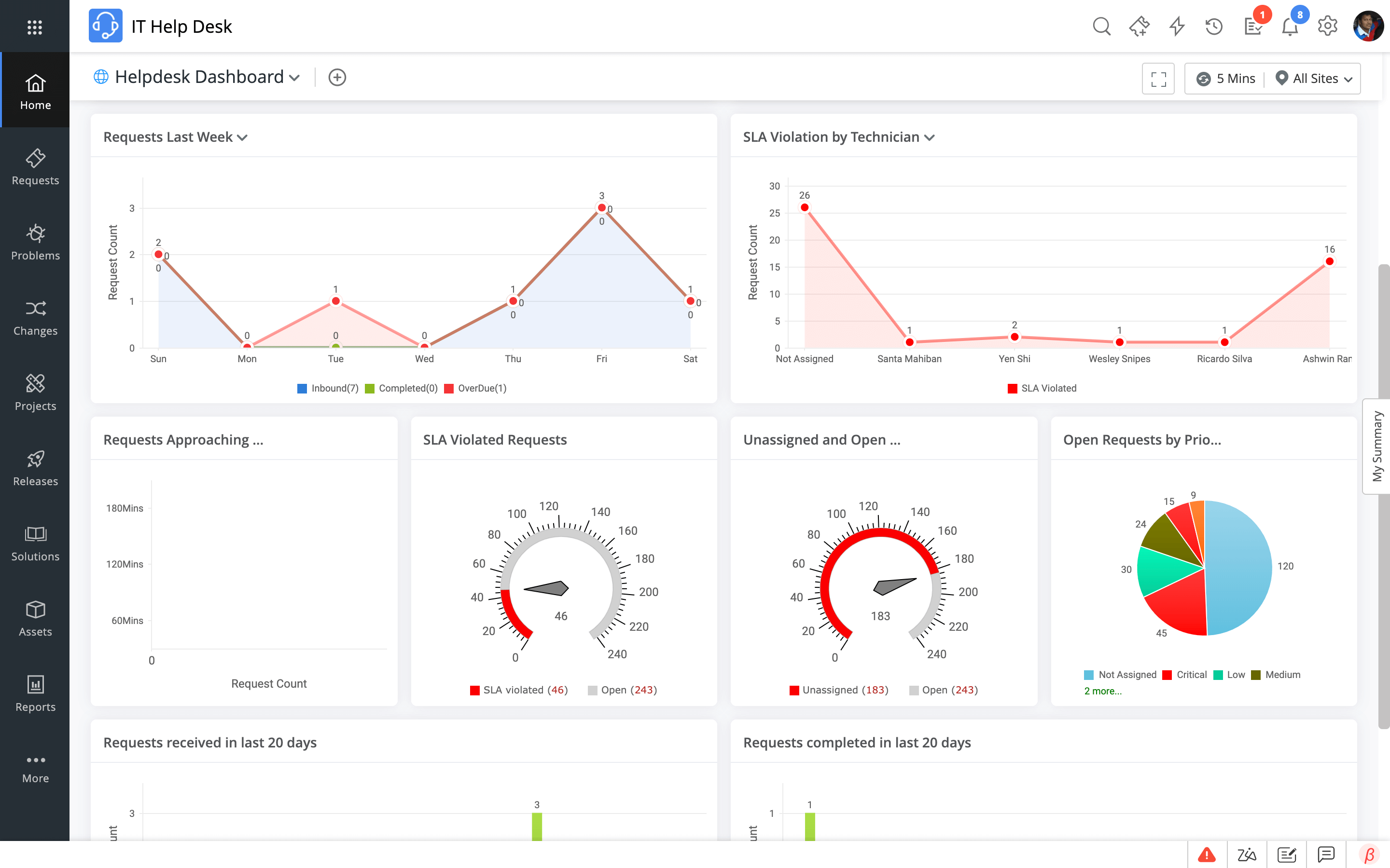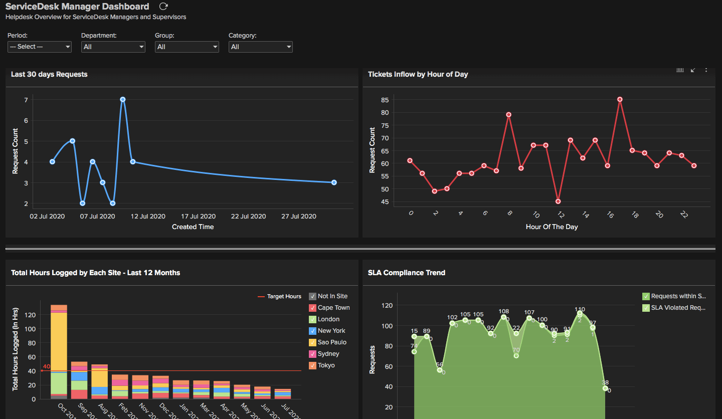 虽然报表提供了详细的数据集合,但 IT 经理将仪表板用作一种进度报表,以获得服务台功能、运营和性能的单一、整体视图。