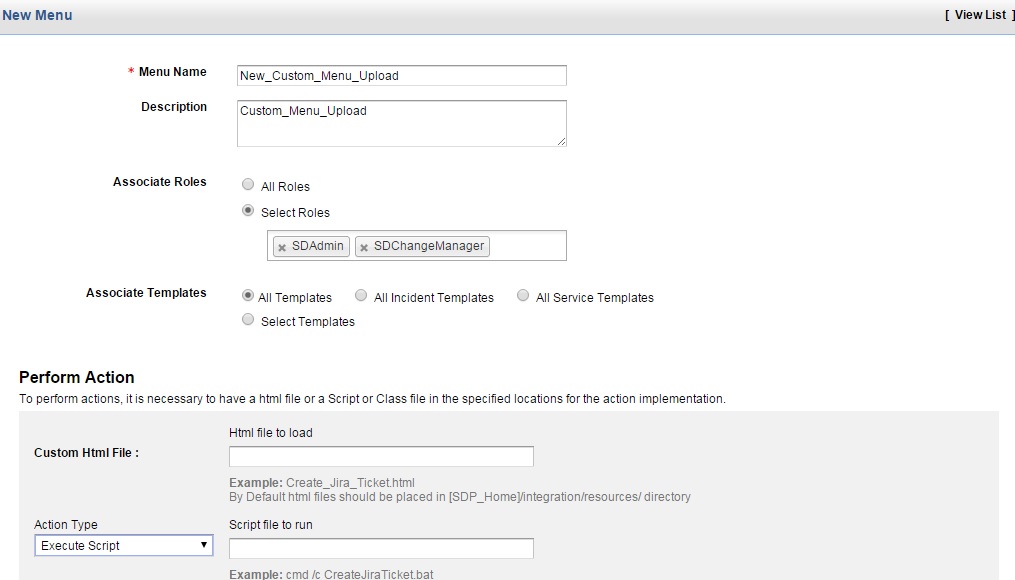Customers can invoke a custom HTML file from Request Custom menus enabling the users to render their own UI from the request menu configurations. This provides an alternate way to integrate third party applications using the user interface. Custom scripts can be executed upon submission of HTML forms.