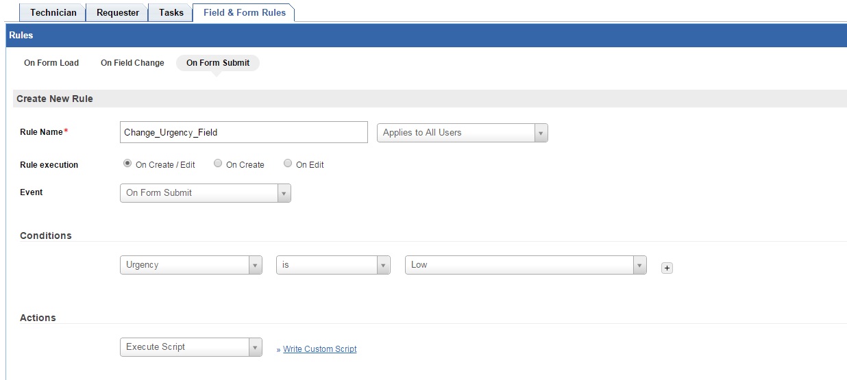 With field and form rules, you can customize incident and service templates to perform customized actions when a form loads, (or) when changing a particular field in a form, (or) when a form is submitted. It is possible to perform actions like, mandate or non-mandate specific fields, enable or disable specific fields, show or hide specific fields in a form and to execute user-specified custom java scripts.