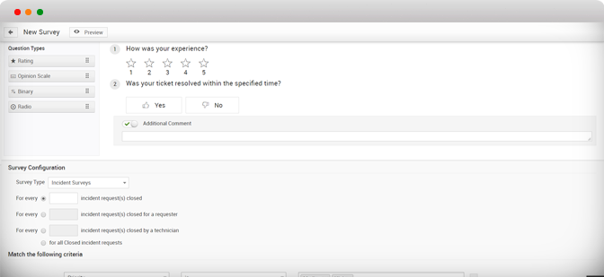 可根据请求参数(如优先级、类别和部门)设定目标群体,此外,调查内容支持多语言