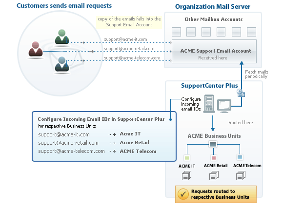 SupportCenter Plus中的业务单位围绕着一个基本理念而构建,即一个部门处理一个或多个产品/服务。组织的每个部门都致力于为最终客户提供支持或服务。这些部门有不同的成员(或技术人员)来关注客户提出的问题。几乎所有的配置都可以基于业务单位的需求来定义,例如类别、优先级、级别等基本配置,以及自定义字段、时区和SLA等复杂配置。此外,它还提供了为每个业务单位配置多个电子邮件ID的功能,这有助于将请求自动路由到相应的业务单位。