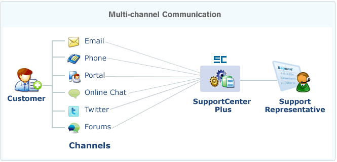 SupportCenter Plus的主要目标之一是让组织能够有效管理来自多个来源(电子邮件、电话、门户、论坛、在线聊天、社交媒体等)的客户通信和交互,并为处理它们的技术人员提供统一的视图。