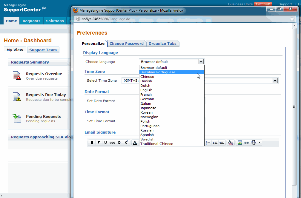现在,您可以使用本地语言运行SupportCenter Plus,并且也支持非英语用户。SupportCenter Plus提供以下16种语言版本。