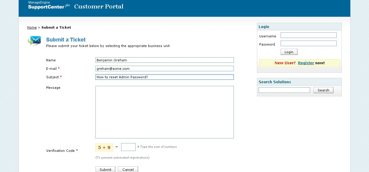 • Send an email to support@yourcompany.com which SupportCenter Plus can pick up and convert into a trouble ticket automatically
