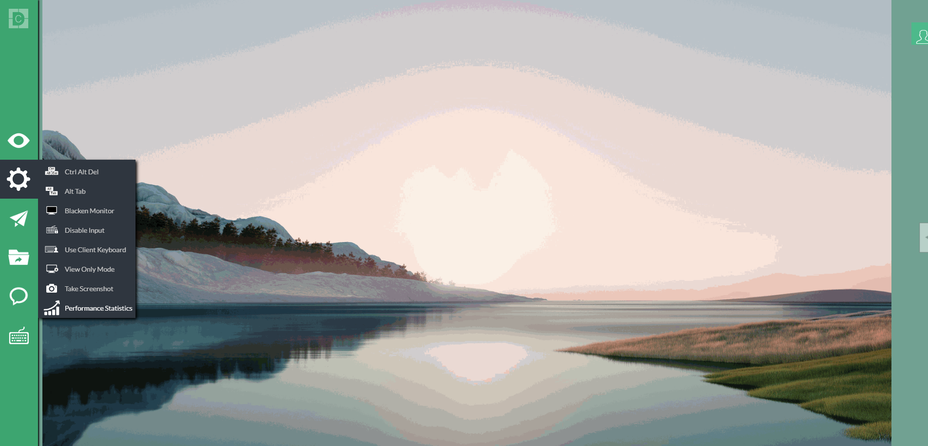 从Remote Access Plus Web控制台启动远程会话。将鼠标悬停在左角的齿轮图标上。点击性能统计以查看实时诊断。