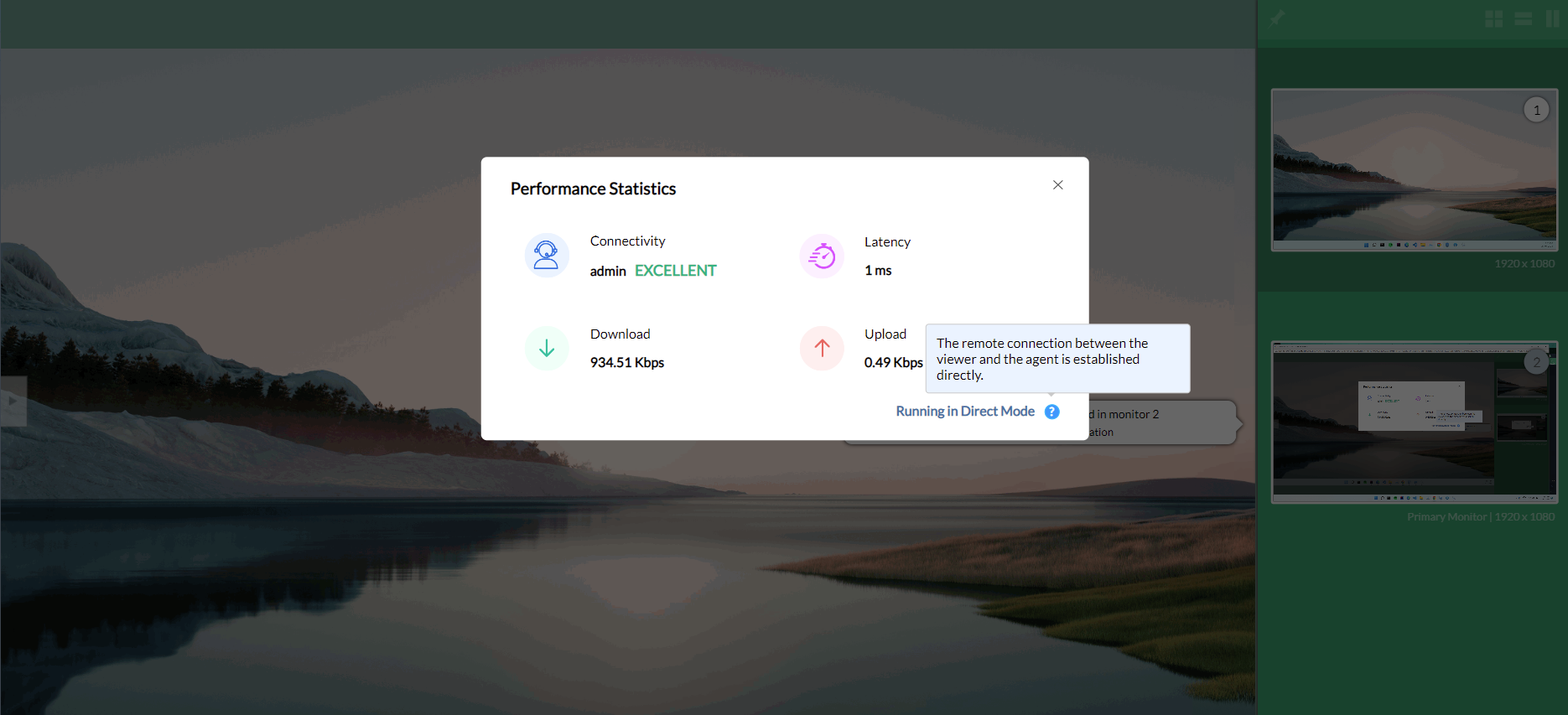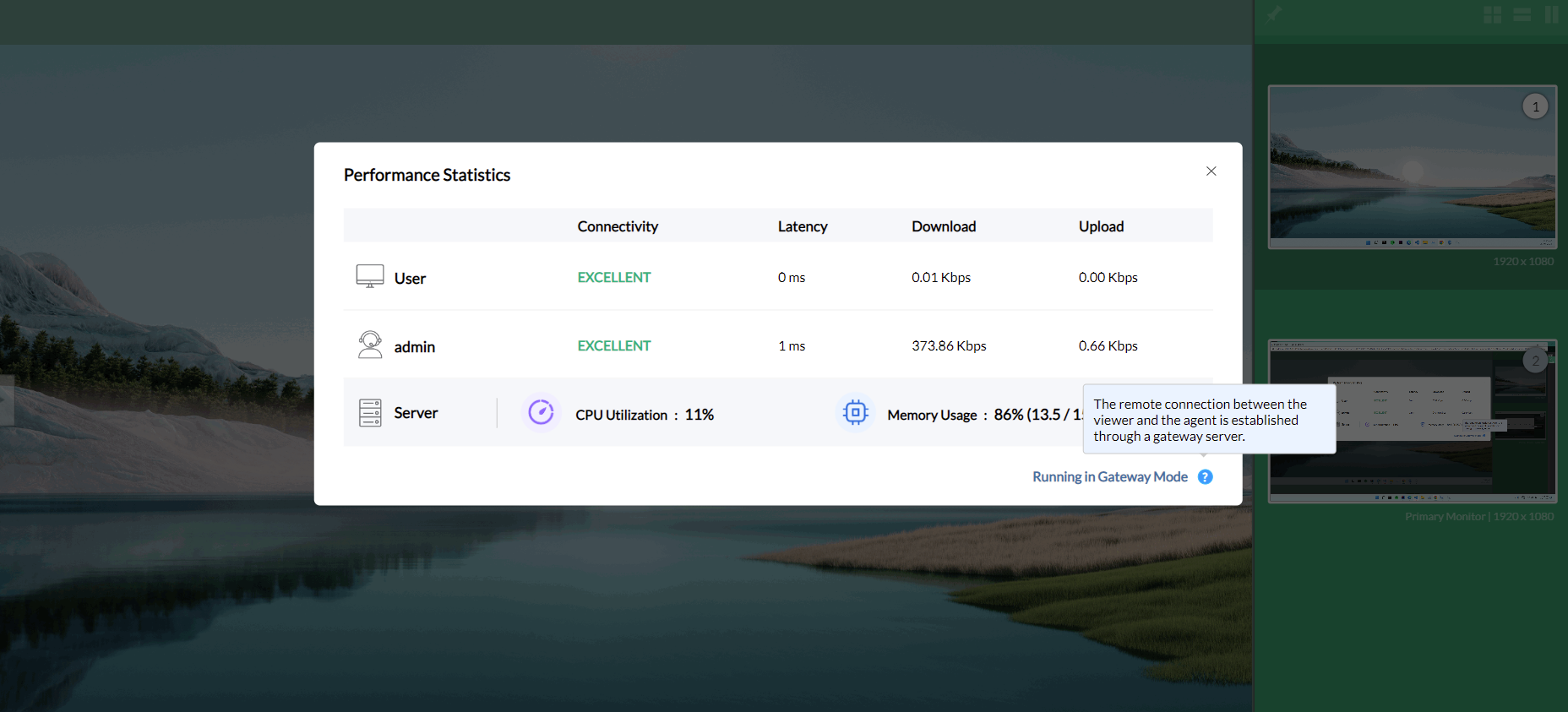 当查看器和代理在同一网络上时,他们将以直接模式进行通信。当查看器和代理在不同的网络上时,他们将通过网关服务器进行通信。了解更多。